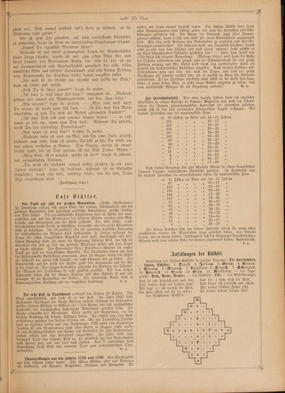 Auflösung des Silben-Räthsels in voriger Nummer: Die Karlsschüler — Laura, Schiller. 1. Daniel. 2. Indiana. 3. Epheu. 4. Kondor. 5. Amanda. 6. Ruppius. 7. Languedoc. 8. Salzach. 9. Schanghai. 10. Ueberfall. 11. Leinöl. 12. Eiche. 13. Reinthaler;— des Logo⸗ griphs: Arm, Arme, Armee;— des Räthsels: List;— des Rösselsprungs: Nun sei mir heimlich zart und lieb; Und dir: o ließe mich die Welt, Setz' deinen Fuß auf meinen nun! Und könnt' ich friedlich und allein, Wie deines leichten Fußes jetzt, Um ganz allein auf dir zu ruh'n; So deines Lebens Träger sein!
