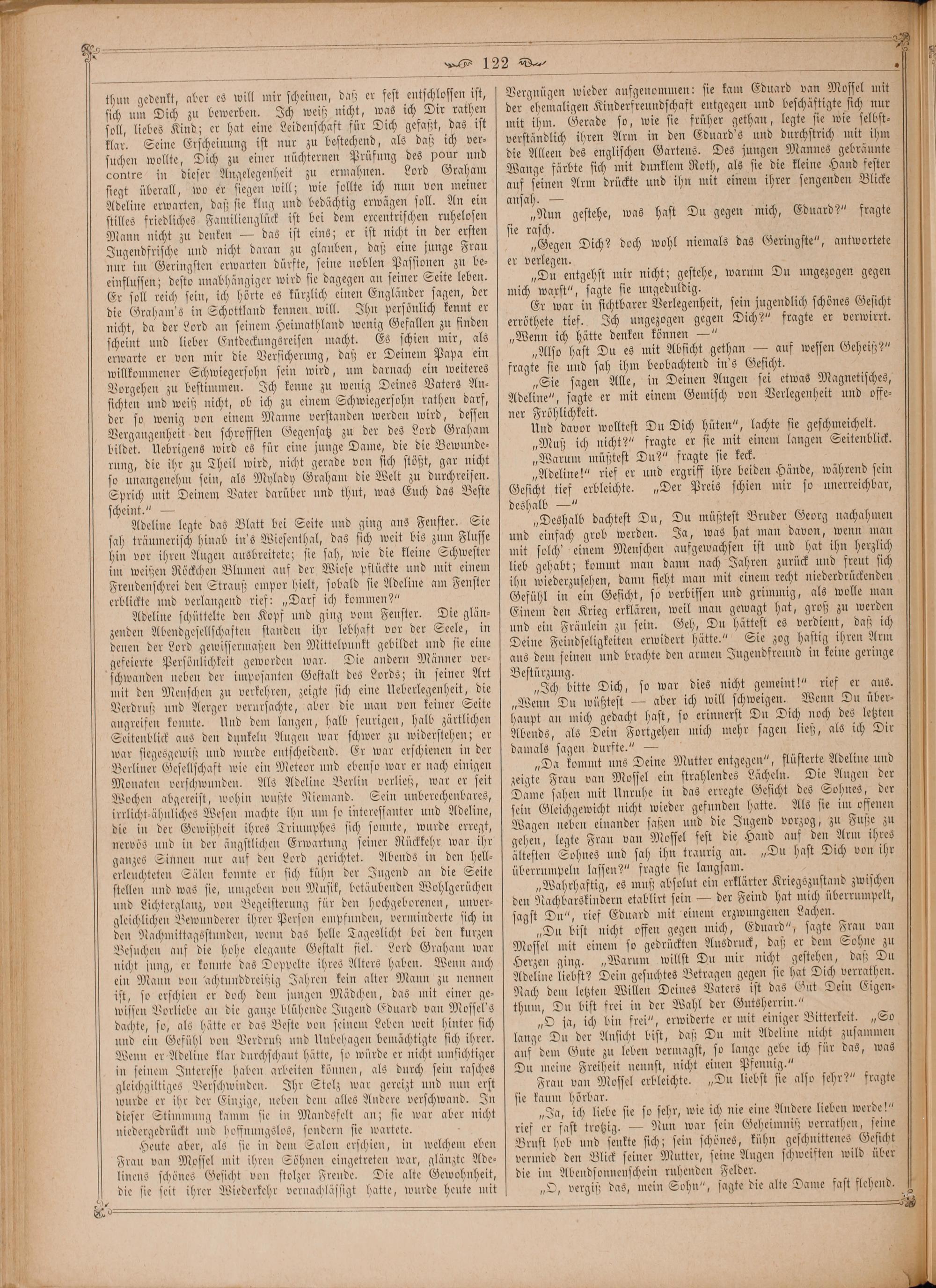 „Deshalb dachtest Du, Du müßtest Bruder Georg nachahmen und einfach grob werden. Ja, was hat man davon, wenn man mit solch' einem Menschen aufgewachsen ist und hat ihn herzlich lieb gehabt; kommt man dann nach Jahren zurück und freut sich ihn wiederzusehen, dann sieht man mit einem recht niederdrückenden Gefühl in ein Gesicht, so verbissen und grimmig, als wolle man Einem den Krieg erklären, weil man gewagt hat, groß zu werden und ein Fräulein zu sein. Geh, Du hättest es verdient, daß ich Deine Feindseligkeiten erwidert hätte.“ Sie zog hastig ihren Arm aus dem seinen und brachte den armen Jugendfreund in keine geringe Bestürzung.