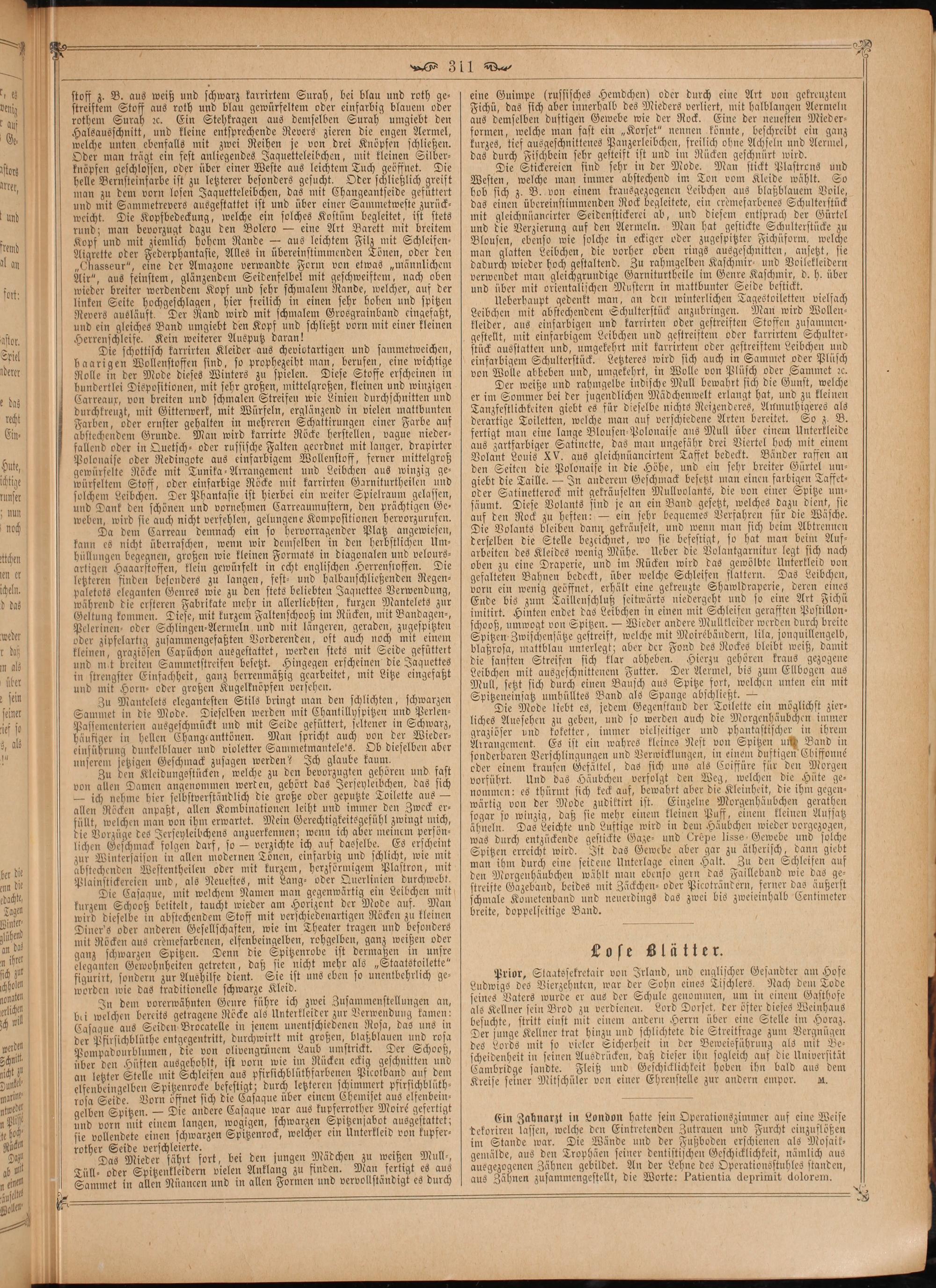 Die Casaque, mit welchem Namen man gegenwärtig ein Leibchen mit kurzem Schooß betitelt, taucht wieder am Horizont der Mode auf. Man wird dieselbe in abstechendem Stoff mit verschiedenartigen Röcken zu kleinen Diner's oder anderen Gesellschaften, wie im Theater tragen und besonders mit Röcken aus cremefarbenen, elfenbeingelben, rohgelben, ganz weißen oder ganz schwarzen Spitzen. Denn die Spitzenrobe ist dermaßen in unsre eleganten Gewohnheiten getreten, daß sie nicht mehr als„Staatstoilette“ figurirt, sondern zur Aushilfe dient. Sie ist uns eben so unentbehrlich ge— worden wie das traditionelle schwarze Kleid.