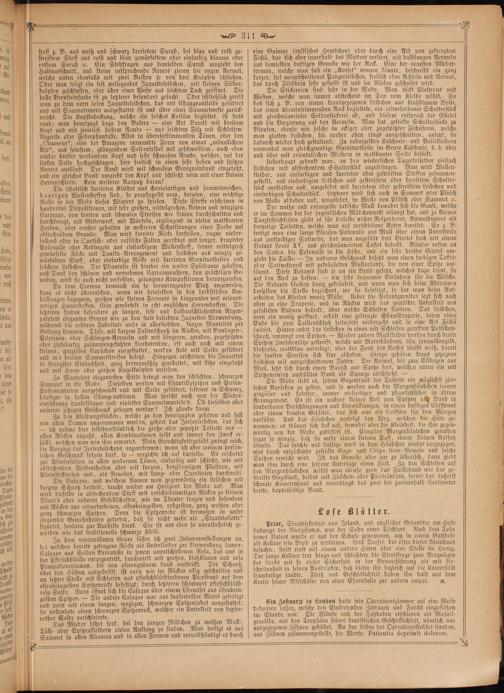 Da dem Carreau demnach ein so hervorragender Platz angewiesen, kann es nicht überraschen, wenn wir demselben in den herbstlichen Um⸗ hüllungen begegnen, großen wie kleinen Formats in diagonalen und velours⸗ artigen Hagarstoffen, klein gewürfelt in echt englischen Herrenstoffen. Die letzteren finden besonders zu langen, fest- und halbanschließenden Regen⸗ paletots eleganten Genres wie zu den stets beliebten Jaquettes Verwendung, während die ersteren Fabrikate mehr in allerliebsten, kurzen Mantelets zur Geltung kommen. Diese, mit kurzem Faltenschooß im Rücken, mit Bandagen⸗, Pelerinen- oder Schlingen⸗Aermeln und mit längeren, geraden, zugespitzten oder zipfelartig zusammengefaßten Vorderenden, oft auch noch mit einem kleinen, graziösen Capüchon auegestattet, werden stets mit Seide gefüttert und mit breiten Sammetstreifen besetzt. Hingegen erscheinen die Jaquettes in strengster Einfachheit, ganz herrenmäßig gearbeitet, mit Litze eingefaßt und mit Horn- oder großen Kugelknöpfen versehen.