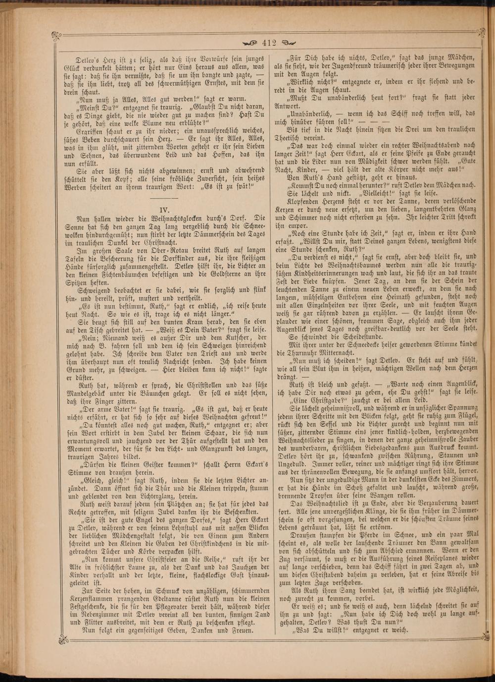 „Sie ist der gute Engel des ganzen Dorfes,“ sagt Herr Eckart zu Detlev, während er von seinem Lehnstuhl aus mit nassen Blicken der lieblichen Mädchengestalt folgt, die von Einem zum Andern schreitet und den Kleinen die Gaben des Christkindchens in die mit— gebrachten Tücher und Körbe verpacken hilft.