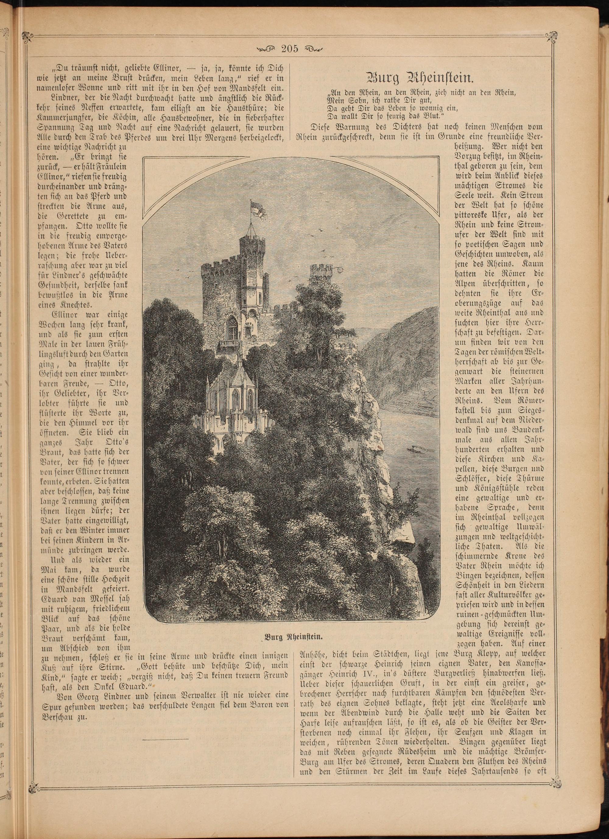 Zurg Mheinstein. „An den Rhein, an den Rhein, zieh nicht an den Rhein, Mein Sohn, ich rathe Dir gut, Da geht Dir das Leben so wonnig ein, Da wallt Dir so feurig das Blut.“ Diese Warnung des Dichters hat noch keinen Menschen vom Rhein zurückgeschreckt, denn sie ist im Grunde eine freundliche Ver— heißung. Wer nicht den
