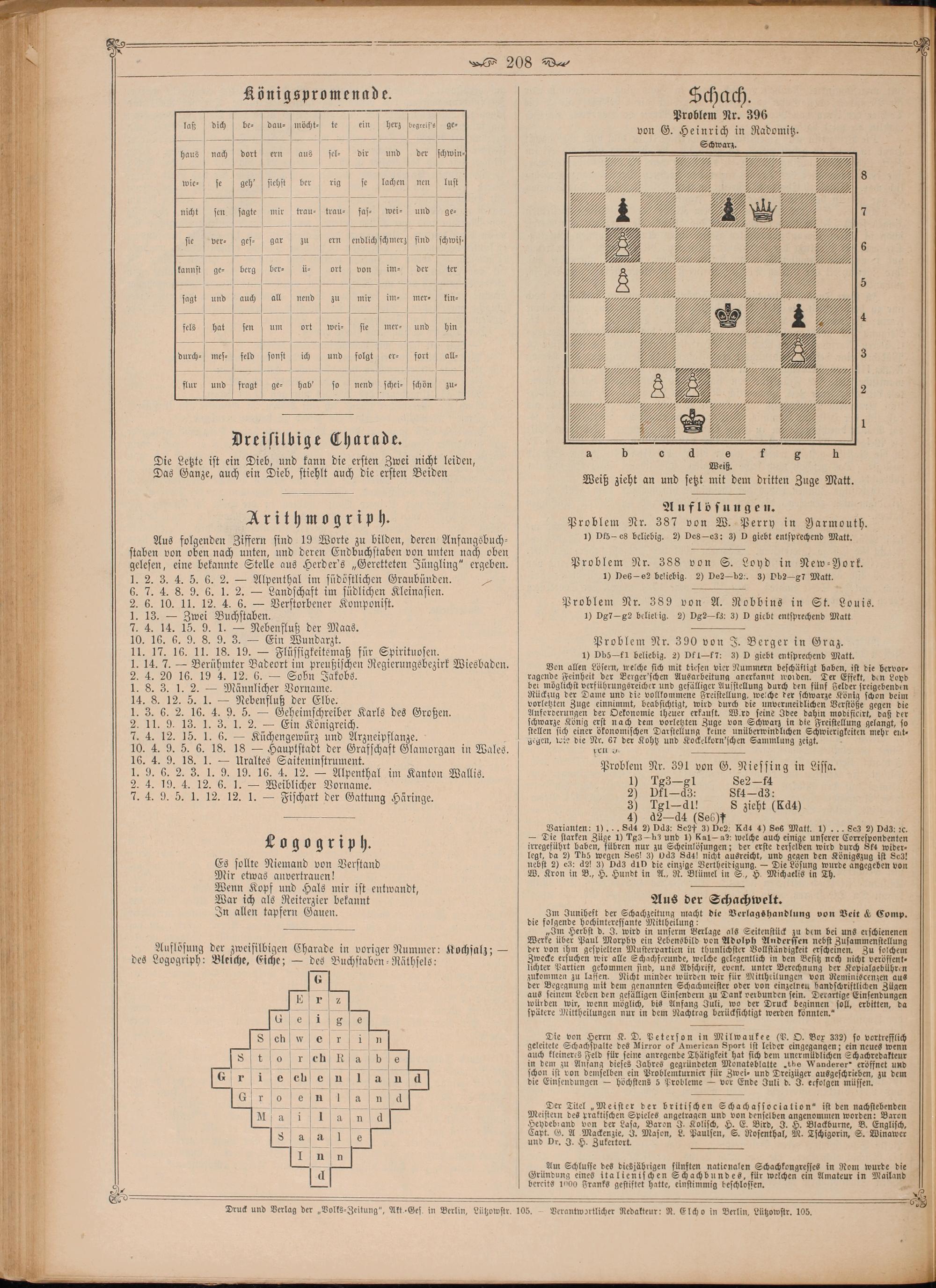 Auflösungen. Problem Nr. 387 von W. Perry in Yarmouth. 1) Df5- es beliebig. 2) Des-e: 3) D giebt entsprechend Matt.