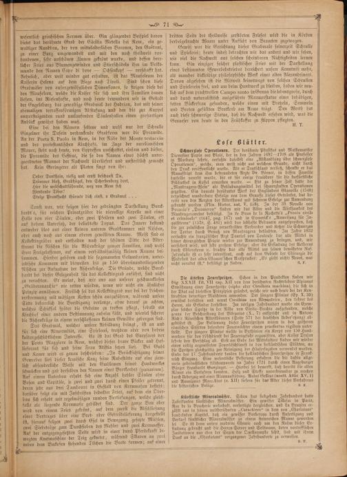 dritten Seite des theilweise zerstörten Frieses wird die in Körben herbeigebrachte Waare unter Aufsicht von Beamten zugewogen. Gewiß war die Errichtung dieses Grabmals seinerzeit Schrulle und Spielerei; heute indeß betrachten wir das anders und wir sehen, wie viel die Nachwelt aus solchen scheinbaren Nichtigkeiten lernen kann. Ein einziger solcher plastischer Fries mit der Darstellung eines bestimmten Gewerbebetriebes bereichert unsere Kenntniß mehr, als manches dickleibige philosophische Werk eines alten Alexandriners. Davon abgesehen ist die Mitwelt keineswegs von solchen Schrullen und Spielerein frei, und um beim Handwerk zu bleiben, haben wir neu— lich auf dem prachtvollen Campo santo in Genua die lebensgroße, durch und durch naturalistisch ausgeführte Marmorstatue einer behäbigen, fetten Bäckerfrau gefunden, welche einen mit Bretzeln, Semmeln und Broten gefüllten Brotkorb am Arme trägt. Den Werth hat auch diese schnurrige Statue, daß die Nachwelt ersehen wird, was die Genueser von heute in den Frühkaffee zu stippen pflegten. H
