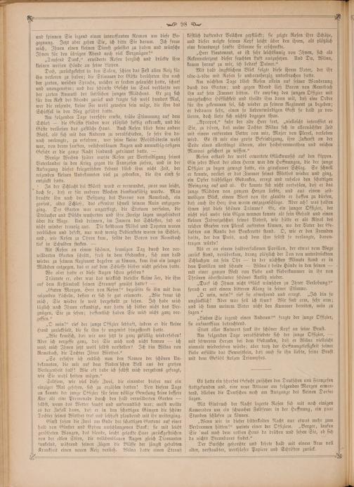 durch den Garten; und gegen Abend ließ Baron von Remsbach ihn auf sein Zimmer bitten. Er empfing den jungen Offizier mit ausgesuchter Höflichkeit und theilte ihm dann mit, daß eine Ordre für ihn gekommen sei, sich wieder zu seinem Regiment zu begeben; er bedauere sehr, einen so liebenswürdigen Gast so bald zu ver⸗ lieren, doch ließe sich nichts dagegen thun.