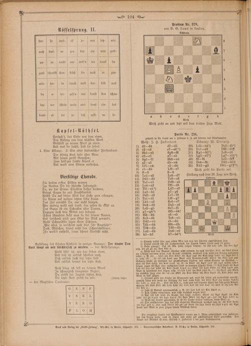 Partie Nr. 216, gespielt in St. Louis am 5. Februar d. J. als siebente des Wettkampfes. Weiß: J. H. Zukertort. Schwarz: W. Steinitz.