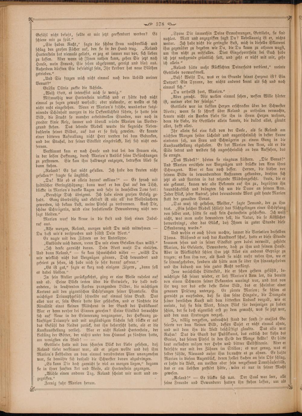 „Das Modell!“ hörten sie ringsum flüstern.„Die Venus!“ Und Marion erröthete vor Vergnügen und drückte den Arm ihres Schwagers. Aber es kam noch besser. Herren, die bisher vor seinem Bilde in bewunderndem Anstaunen gestanden, drehten sich jetzt ab und starrten in das reizende Mädchengesicht. Leute, die er nie gekannt, kamen wie alte Bekannte auf ihn zu, begrüßten ihn freundschaftlich und drängten sich um die Dame an seinem Arm. Jeder Blick, jeder Ausruf, jedes bewundernde Wort galt heute Marion statt der gemalten Venus.