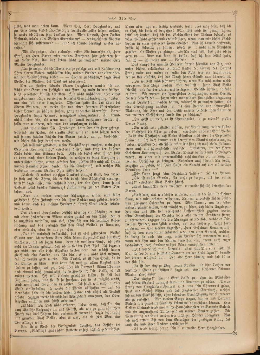 „Ich will mir gestatten, meine Vorschläge zu machen, mein Herr Geheimer Kommerzrath,“ erwiderte dieser, und trotz der äußeren Ruhe bebte seine Stimme doch.„Ehe ich dieses aber thue,“ fuhr er dann nach einer kleinen Pause, in welcher er seine Erregung zu unterdrücken suchte, etwas gefaßter fort,„lassen Sie mich als Haupt meiner Familie Ihnen danken für die Großmuth, mit welcher Sie wiederum meinem Bruder Ihre Hilfe leihen.“