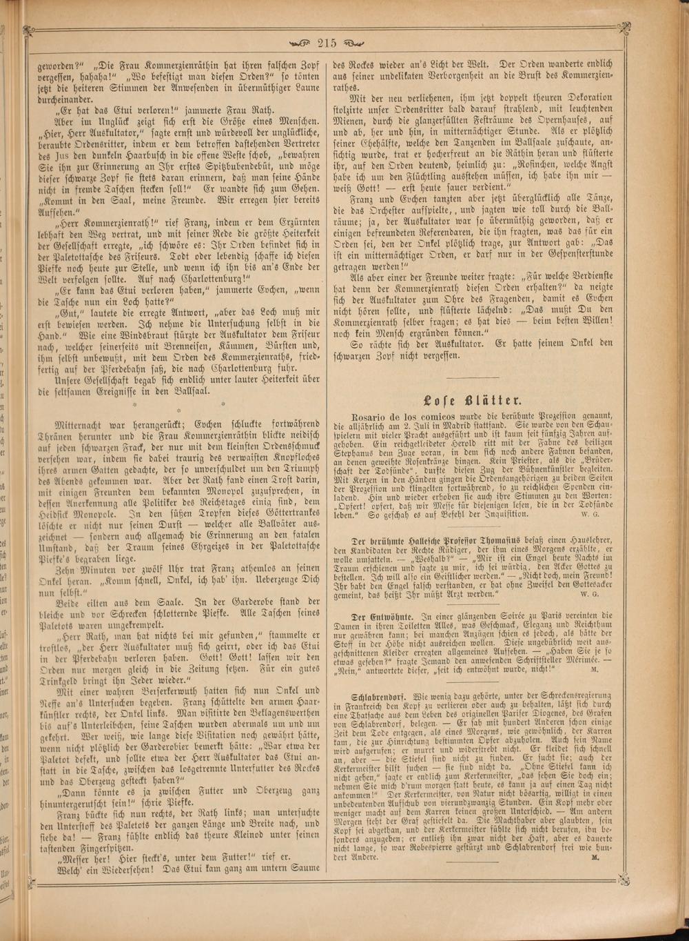 Als aber einer der Freunde weiter fragte:„Für welche Verdienste hat denn der Kommerzienrath diesen Orden erhalten?“ da neigte sich der Auskultator zum Ohre des Fragenden, damit es Evchen nicht hören sollte, und flüsterte lächelnd:„Das mußt Du den Kommerzienrath selber fragen; es hat dies— beim besten Willen! noch kein Mensch ergründen können.“