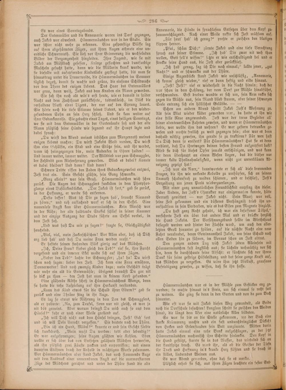 „Lieber den Tod!“ lachte der Schmuggler;„ha! ha! Du wirst schon noch sagen: lieber den Jost. Ich kann eine Frau ernähren, Donnerwetter! Und noch zwanzig Kinder dazu; mein Geschäft trägt mir mehr ein als die Entenmühle; übrigens brauchst Du gar nit so dick zu thun— den Jost hat man in keinem Korb gefunden.“