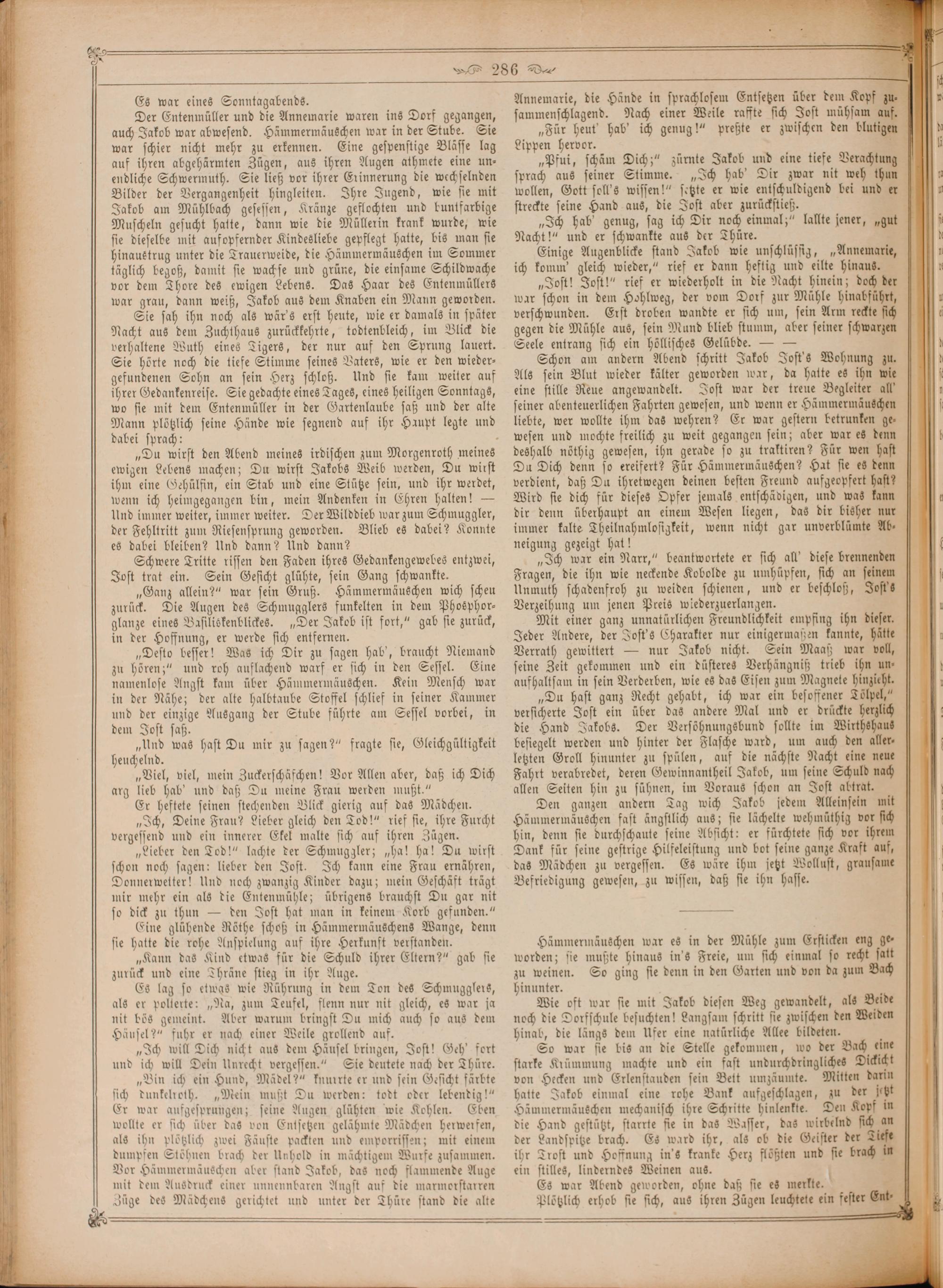 „Desto besser! Was ich Dir zu sagen hab', braucht Niemand zu hören;“ und roh auflachend warf er sich in den Sessel. Eine namenlose Angst kam über Hämmermäuschen. Kein Mensch war in der Nähe; der alte halbtaube Stoffel schlief in seiner Kammer und der einzige Ausgang der Stube führte am Sessel vorbei, in dem Jost saß.