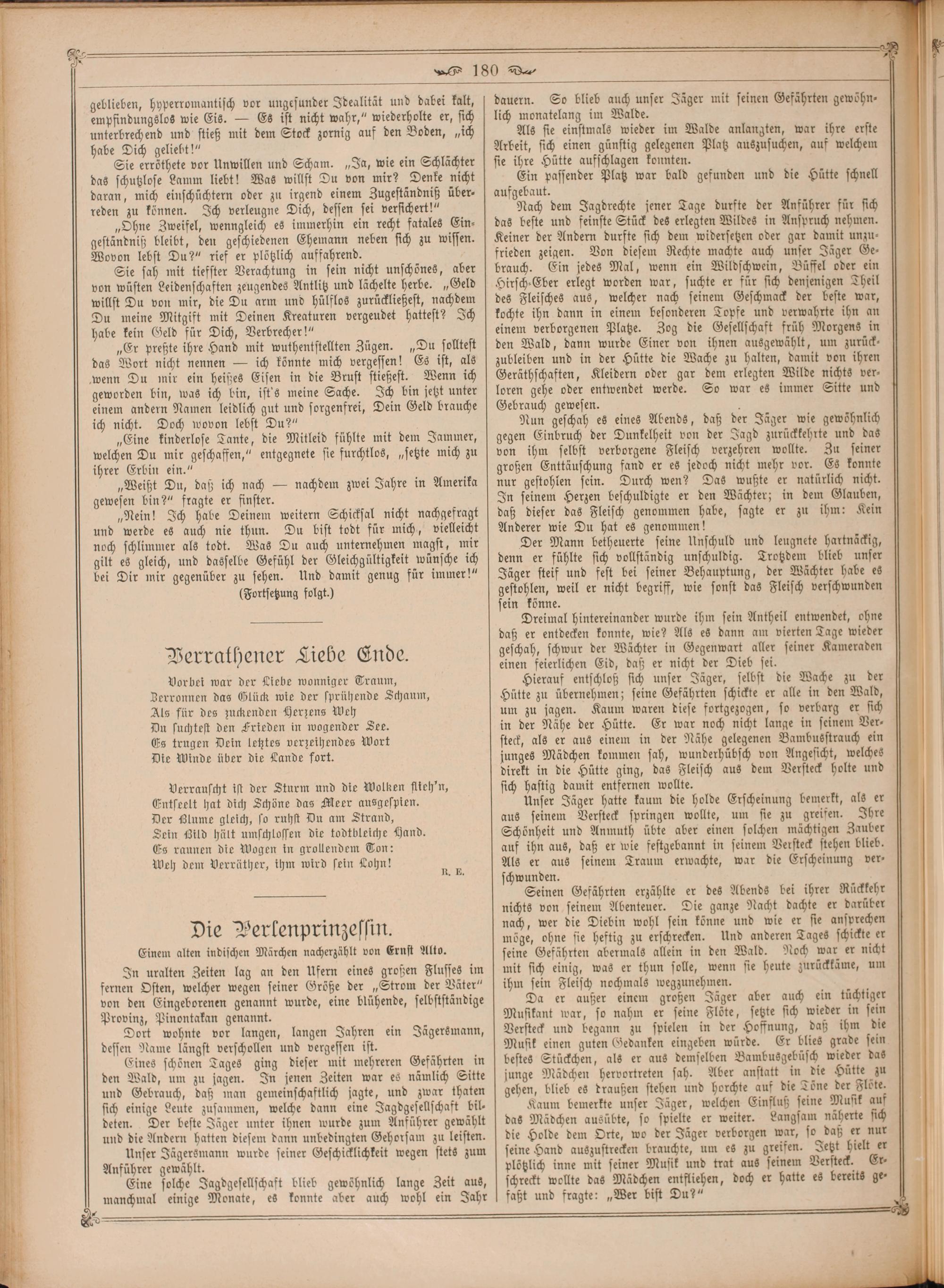Unser Jäger hatte kaum die holde Erscheinung bemerkt, als er aus seinem Versteck springen wollte, um sie zu greifen. Ihre Schönheit und Anmuth übte aber einen solchen mächtigen Zauber auf ihn aus, daß er wie festgebannt in seinem Versteck stehen blieb. Als er aus seinem Traum erwachte, war die Erscheinung ver⸗ schwunden.