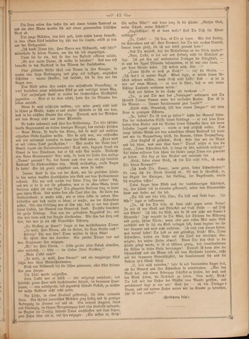 „O, laßt mich ausreden,“ fuhr sie mit flammenden Augen fort, als der General und ihre Schwestern sie unterbrachen.„Wer den Muth hat, mit einem Federzuge Schicksal zu spielen, der muß auch den Muth haben, die Wahrheit zu hören. Nun wohl, Erich! Du hast mir den Becher des Glückes vom Munde gerissen, und zertrümmert liegt er vor mir! Sieh her— ich bin Diringer's Braut, und mit meinen Zinsen waren wir im Stande zu heirathen, jetzt ist das vorbei!“—