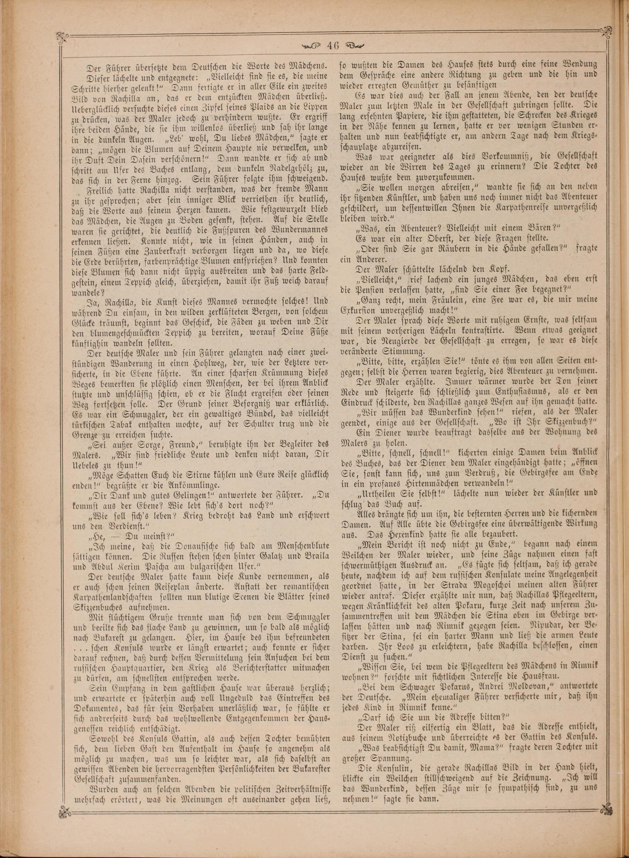 „Mein Bericht ist noch nicht zu Ende,“ begann nach einem Weilchen der Maler wieder, und seine Züge nahmen einen fast schwermüthigen Ausdruck an.„Es fügte sich seltsam, daß ich gerade heute, nachdem ich auf dem russischen Konsulate meine Angelegenheit geordnet hatte, in der Strada Mogoschoi meinen alten Führer wieder antraf. Dieser erzählte mir nun, daß Rachillas Pflegeeltern, wegen Kränklichkeit des alten Pokaru, kurze Zeit nach unserem Zu⸗ sammentreffen mit dem Mädchen die Stina oben im Gebirge ver— lassen hätten und nach Rimnik gezogen seien. Nipudar, der Be⸗ sitzer der Stina, sei ein harter Mann und ließ die armen Leute darben. Ihr Loos zu erleichtern, habe Rachilla beschlossen, einen Dienst zu suchen.“