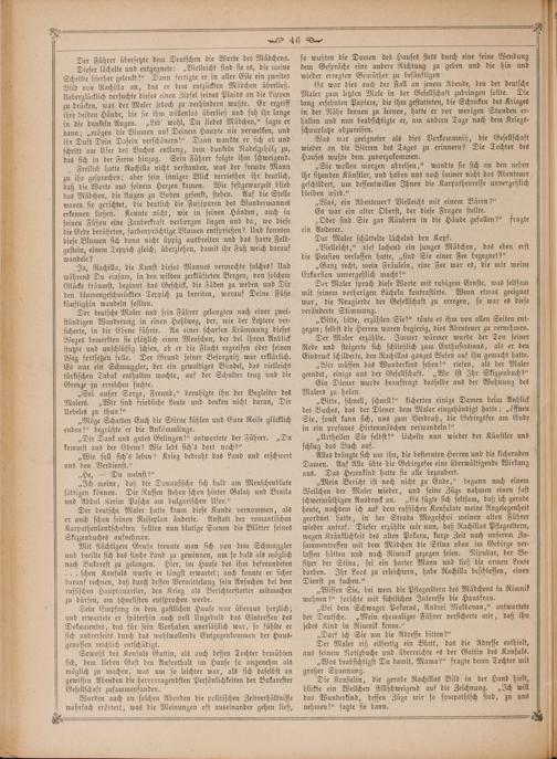 Der deutsche Maler und sein Führer gelangten nach einer zwei— stündigen Wanderung in einen Hohlweg, der, wie der Letztere ver⸗ sicherte, in die Ebene führte. An einer scharfen Krümmung dieses Weges bemerkten sie plötzlich einen Menschen, der bei ihrem Anblick stutzte und unschlüssig schien, ob er die Flucht ergreifen oder seinen Weg fortsetzen solle. Der Grund seiner Besorgniß war erklärlich. Es war ein Schmuggler, der ein gewaltiges Bündel, das vielleicht türkischen Tabak enthalten mochte, auf der Schulter trug und die Grenze zu erreichen suchte.