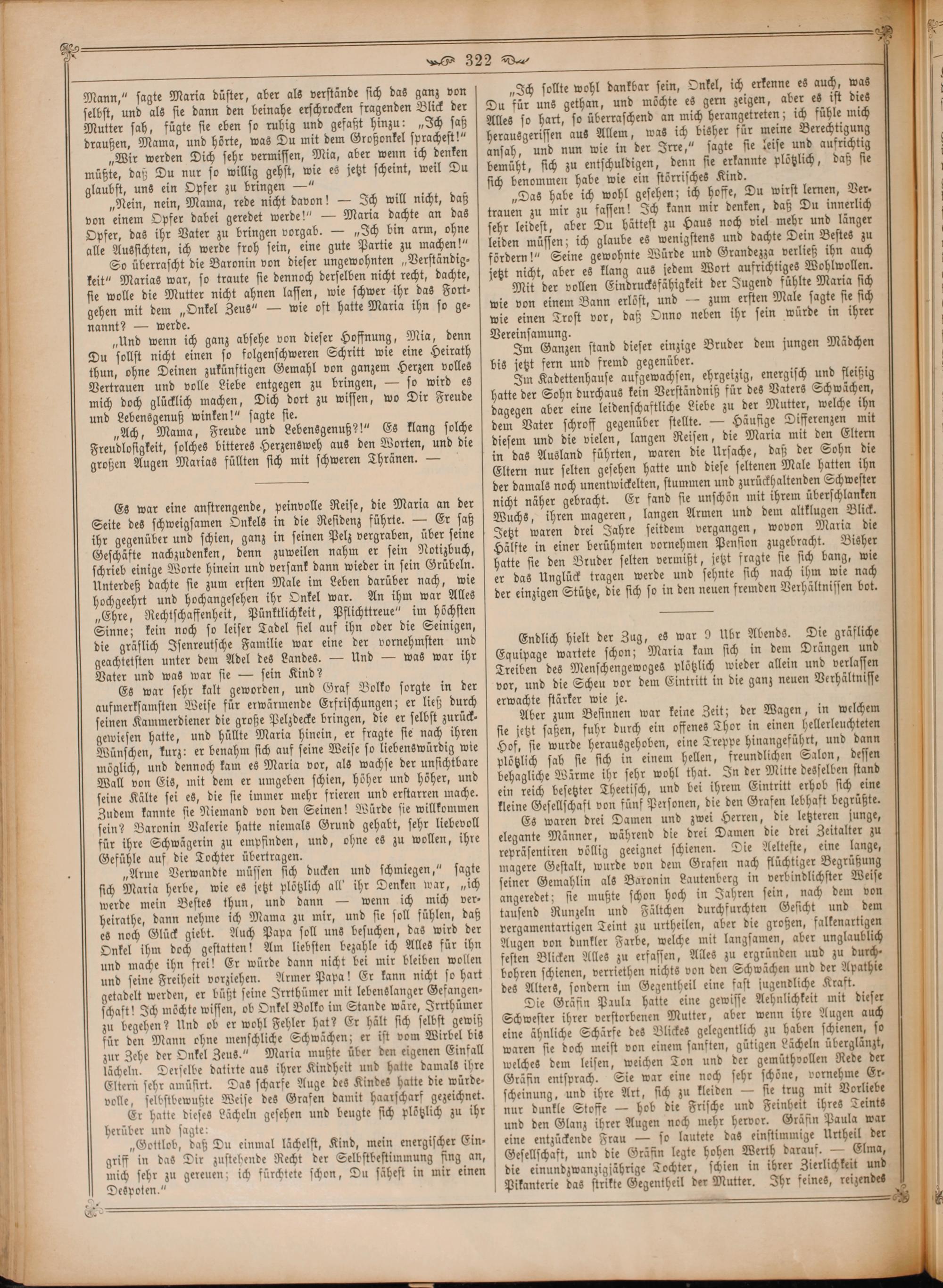 Es war eine anstrengende, peinvolle Reise, die Maria an der Seite des schweigsamen Onkels in die Residenz führte.— Er saß ihr gegenüber und schien, ganz in seinen Pelz vergraben, über seine Geschäfte nachzudenken, denn zuweilen nahm er sein Notizbuch, schrieb einige Worte hinein und versank dann wieder in sein Grübeln. Unterdeß dachte sie zum ersten Male im Leben darüber nach, wie hochgeehrt und hochangesehen ihr Onkel war. An ihm war Alles „Ehre, Rechtschaffenheit, Pünktlichkeit, Pflichttreue“ im höchsten Sinne; kein noch so leiser Tadel fiel auf ihn oder die Seinigen, die gräflich Isenreutsche Familie war eine der vornehmsten und geachtetsten unter dem Adel des Landes.— Und— was war ihr Vater und was war sie— sein Kind?