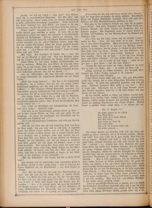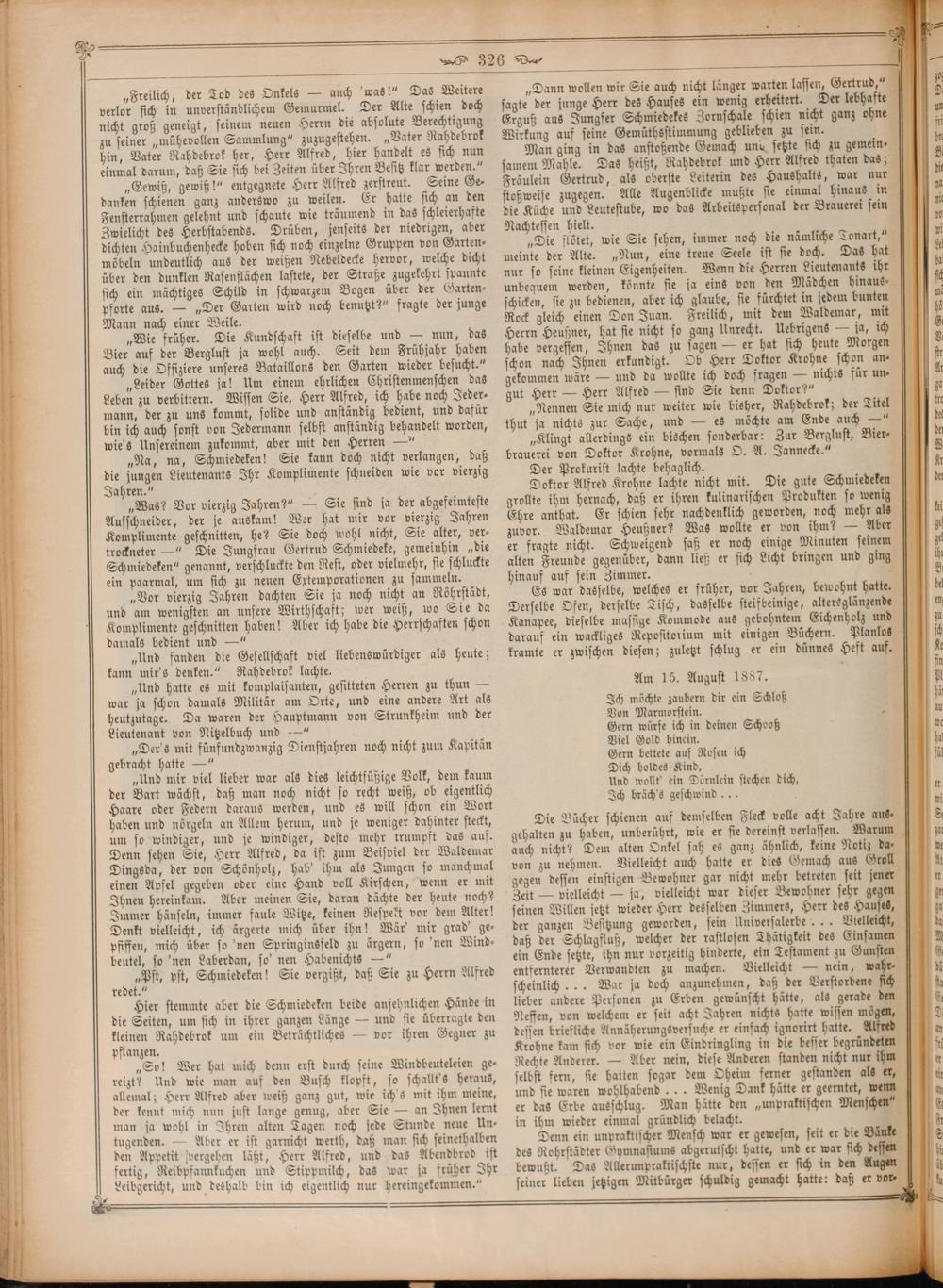 „Und hatte es mit komplaisanten, gesitteten Herren zu thun— war ja schon damals Militär am Orte, und eine andere Art als heutzutage. Da waren der Hauptmann von Strunkheim und der Lieutenant von Nitzelbuch und—“