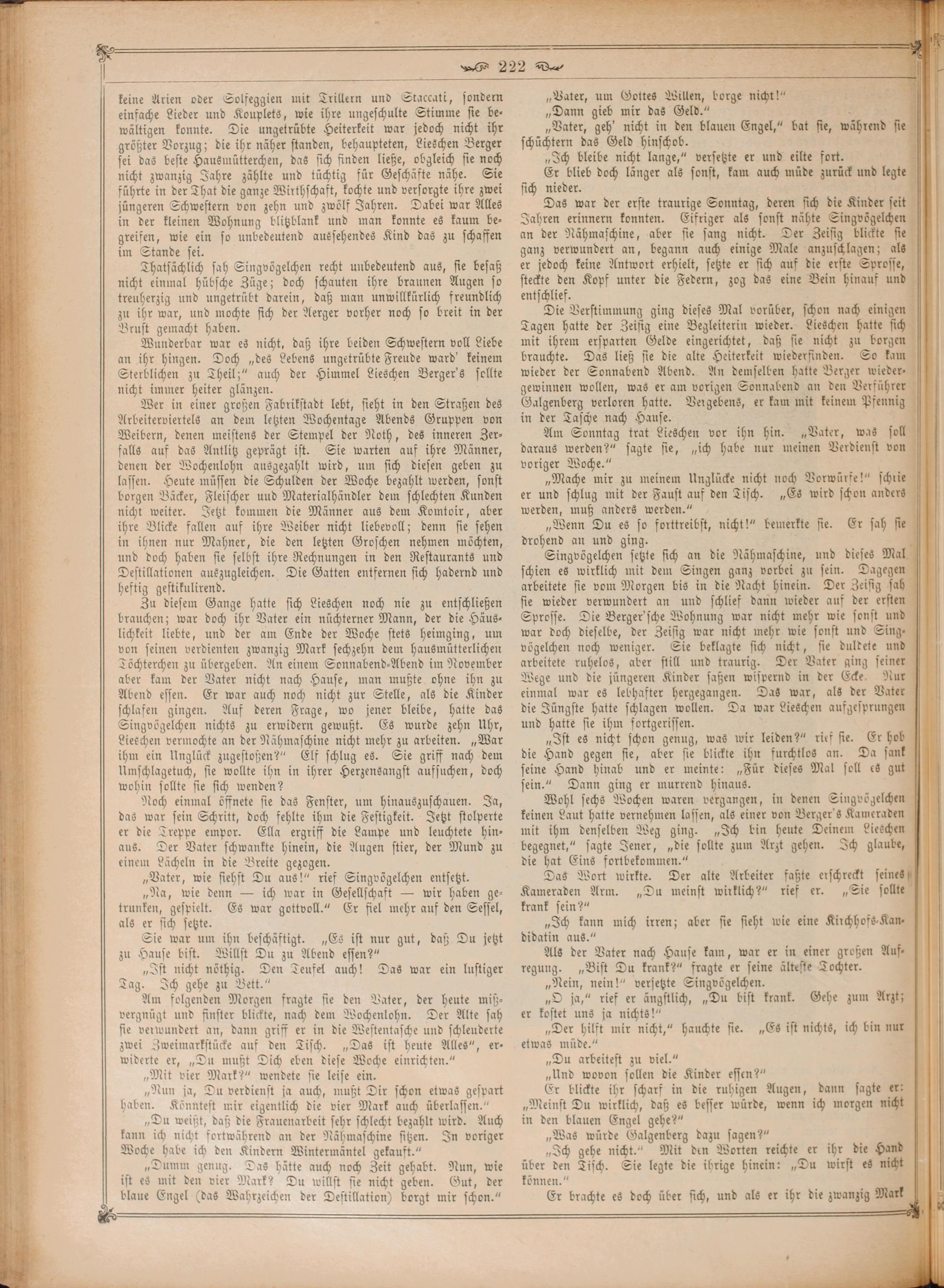 keine Arien oder Solfeggien mit Trillern und Staccati, sondern einfache Lieder und Kouplets, wie ihre ungeschulte Stimme sie be⸗ wältigen konnte. Die ungetrübte Heiterkeit war jedoch nicht ihr größter Vorzug; die ihr näher standen, behaupteten, Lieschen Berger sei das beste Hausmütterchen, das sich finden ließe, obgleich sie noch nicht zwanzig Jahre zählte und tüchtig für Geschäfte nähe. Sie führte in der That die ganze Wirthschaft, kochte und versorgte ihre zwei jüngeren Schwestern von zehn und zwölf Jahren. Dabei war Alles in der kleinen Wohnung blitzblank und man konnte es kaum be⸗ greifen, wie ein so unbedeutend aussehendes Kind das zu schaffen im Stande sei.