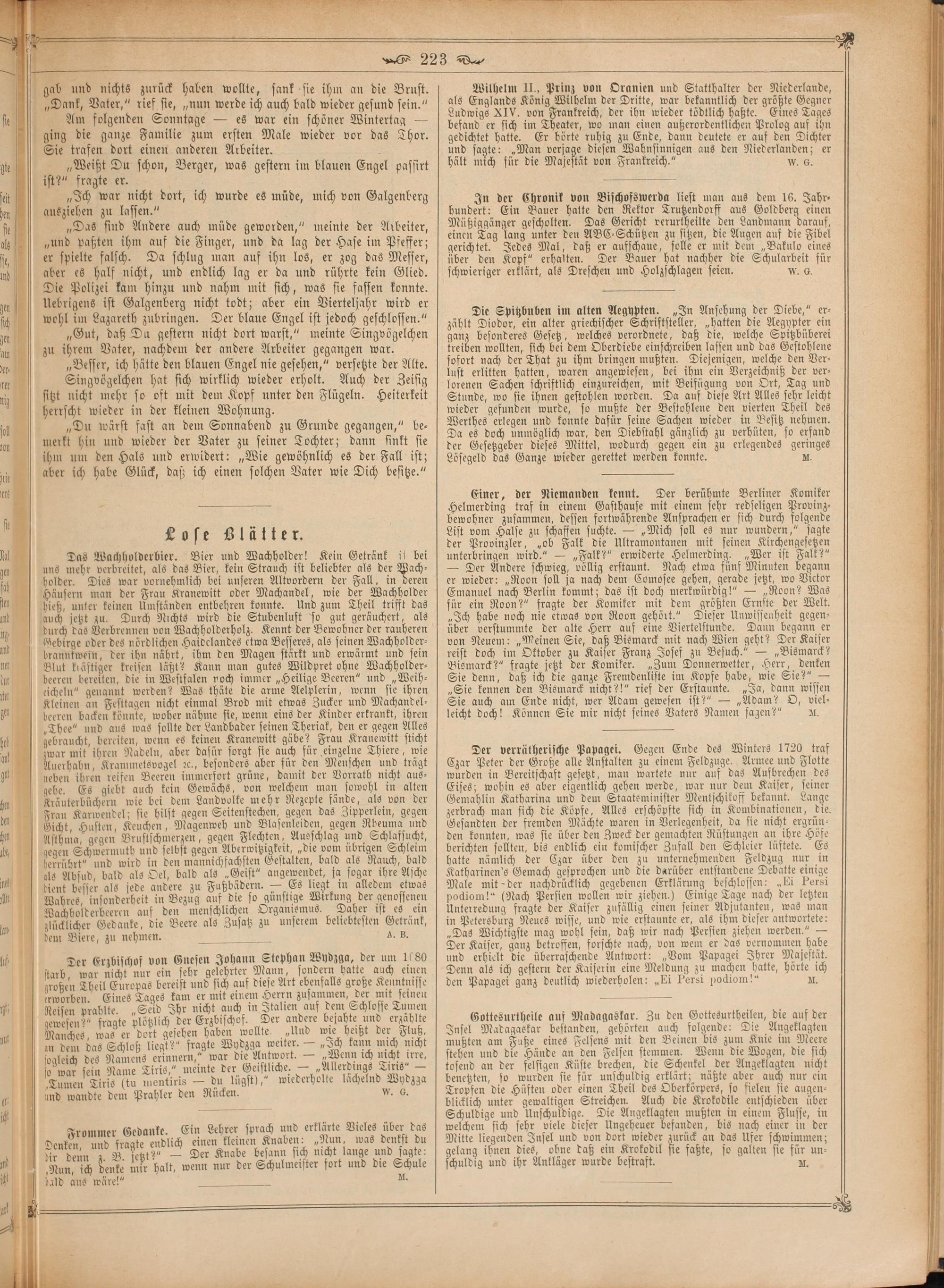 Wilhelm II., Prinz von Oranien und Statthalter der Niederlande, als Englands König Wilhelm der Dritte, war bekanntlich der größte Gegner Ludwigs XIV. von Frankreich, der ihn wieder tödtlich haßte. Eines Tages befand er sich im Theater, wo man einen außerordentlichen Prolog auf ihn gedichtet hatte. Er hörte ruhig zu Ende, dann deutete er auf den Dichter und sagte:„Man verjage diesen Wahnsinnigen aus den Niederlanden; er hält mich für die Maseftät von Frankreich.“ W. G.