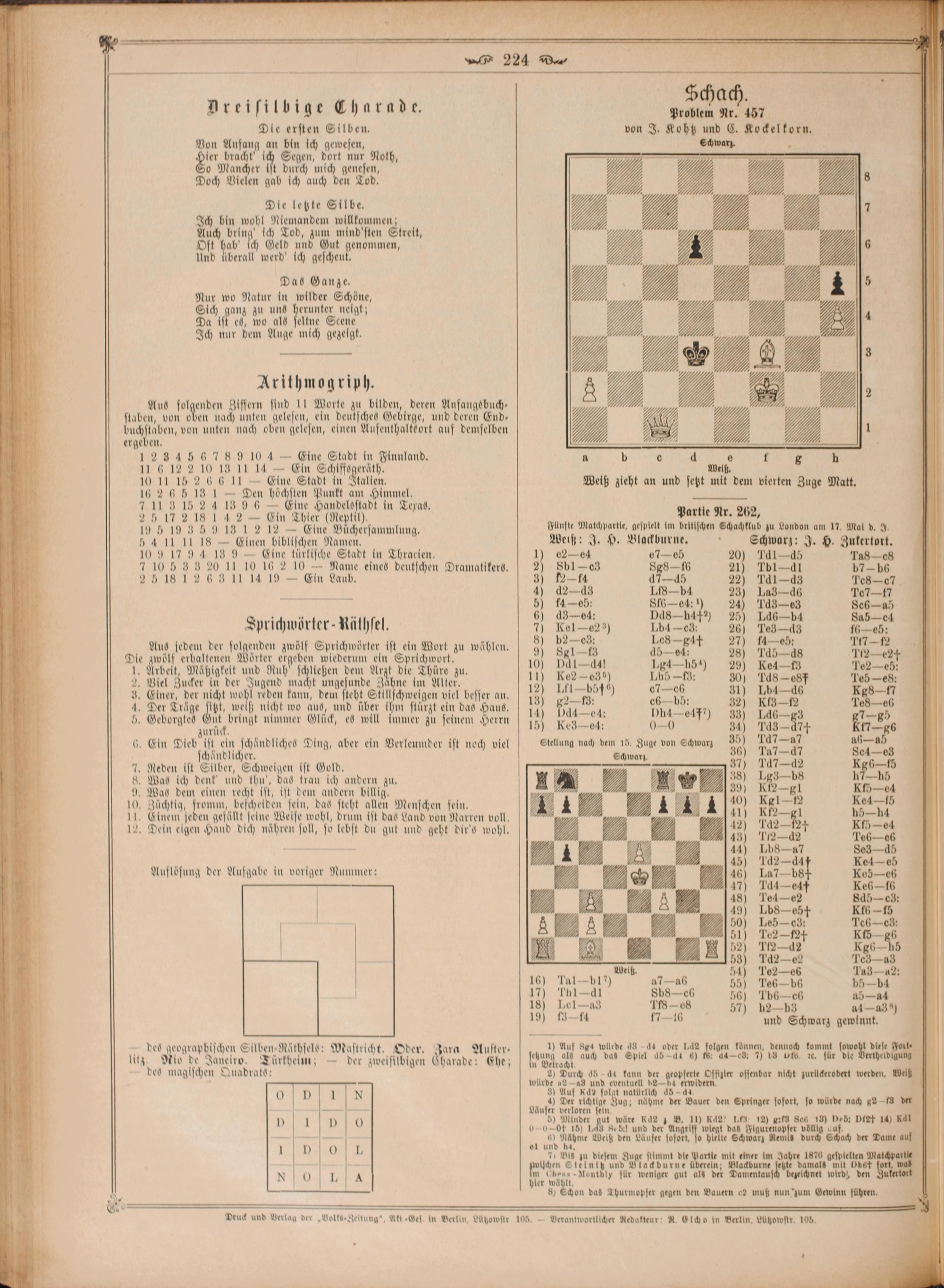 25 17;. Thier(5 Partie Nr. 262, 3 0. 5 a 155 5 0 7 a WBichersammlung. Fünfte Matchpartle, gesplelt um britlschen Schachklub zu London am 17. Mal d. g. 5 4 11 1 18— Einen biblischen Ramen. Weiß: J. H. Blackburne. Schwarz: J. H. Zutertort. 10 9 179 4 139— Eine türlische Stadt in Thracien. 2 02— 64 7 eh 20) JdI-d Tas-es 7 10 5 3 3 20 11 10 16 2 10— Name eines deutschen Dramatikers. 2) 8b1-en 88816 21) 11-41 b7- b 2 5 18 12 6 3 11 14 19— Ein Laub. 8) 2—f4 d- d 22) 1d1—d3 Tes-e? f ö 4) 42-43 18—b4 23) Lag ds 707.7 C 1 3 8 3e:—) 5—b4 aß-e Iprichwörker-Mäthsel. 90 12155 5 8 77. e 10.—eb: Aus sedem der folgenden zwölf Sprichwörter ist ein Wort zu wählen. 1 Fefe 2 1 0 wölf erhaltenen Wörter ergeben wiederum ein 9 959 5 10 59 9.— 2 I bel, Mäßhigkeit und Ruh' schlleßen dem Arzt die Thüre zu. 0 166. ö Ke— 12—eb: 1 9 11) Koe?- e398) L605-g: 30) J ds-esf. Jeb-es: 2. Viel Zucker in der Jugend macht a eh Zähne im Alter. 121 LI—b54 706 10 . Einer, der nicht 1 reden kanu, deu steht Stillschweigen viel besser an. 18 123 10 9— 1 58—4 4. Der Träge 18 welß nicht wo aus, und über 145 stürzt ein das Haus. 140. ht ef 88 8 e Tes e 5. Geborgtes 95 05 nimmer Glülc, e will immer zu seinem Herrn 15) Kegel: 00 31 103 47 Kr 86 6. Ein Dieb“ ist 91 schändliches Ding, aber ein Verleumder ist noch viel Stellung nach dem 1b. Zuge von Schwar) 350 df—47 aß. ab scha ud licher. Schwarz. 36) Ta7-d7 Set- eg