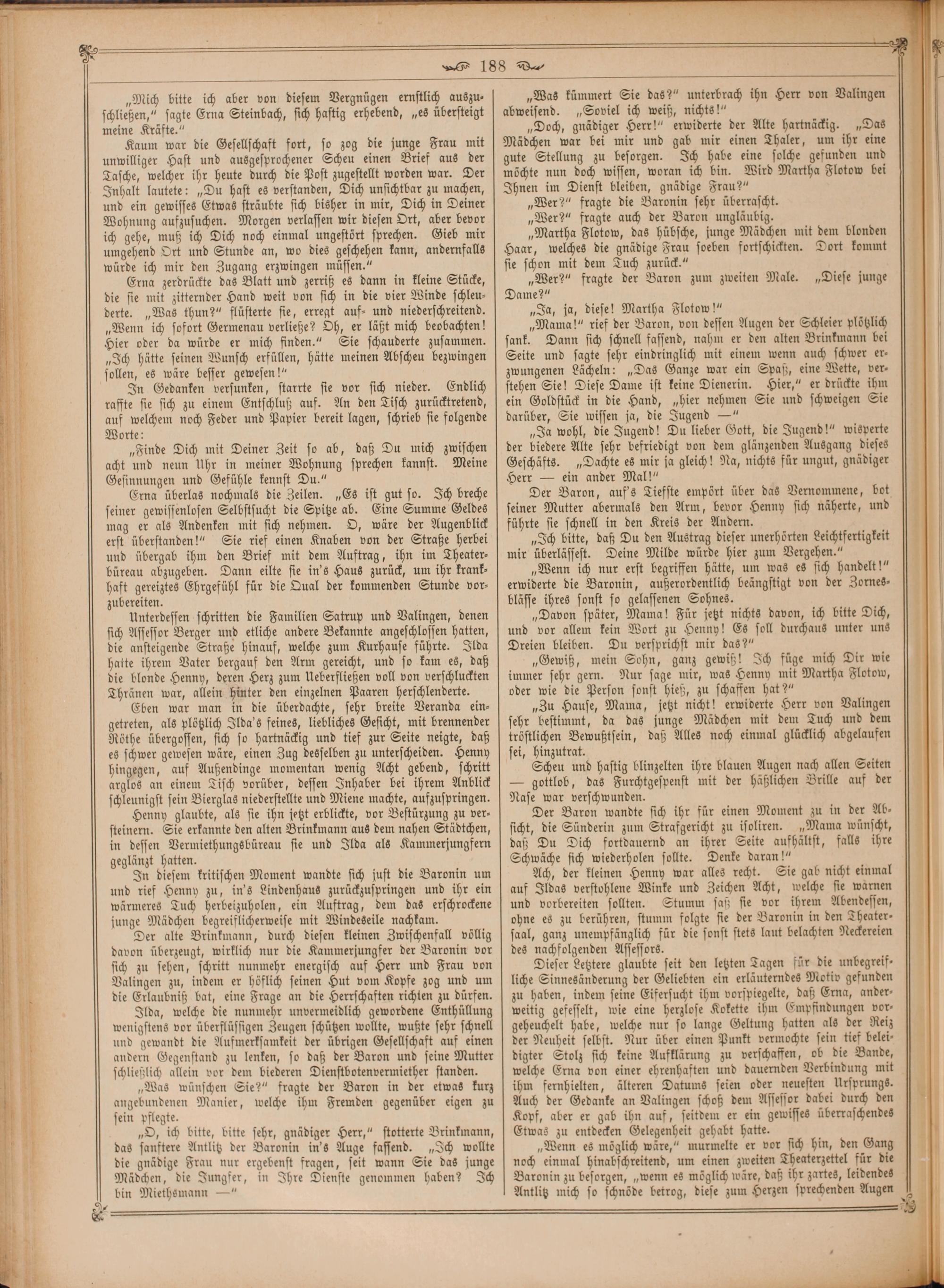 Kaum war die Gesellschaft fort, so zog die junge Frau mit unwilliger Hast und ausgesprochener Scheu einen Brief aus der Tasche, welcher ihr heute durch die Post zugestellt worden war. Der Inhalt lautete:„Du hast es verstanden, Dich unsichtbar zu machen, und ein gewisses Etwas sträubte sich bisher in mir, Dich in Deiner Wohnung aufzusuchen. Morgen verlassen wir diesen Ort, aber bevor ich gehe, muß ich Dich noch einmal ungestört sprechen. Gieb mir umgehend Ort und Stunde an, wo dies geschehen kann, andernfalls würde ich mir den Zugang erzwingen müssen.“