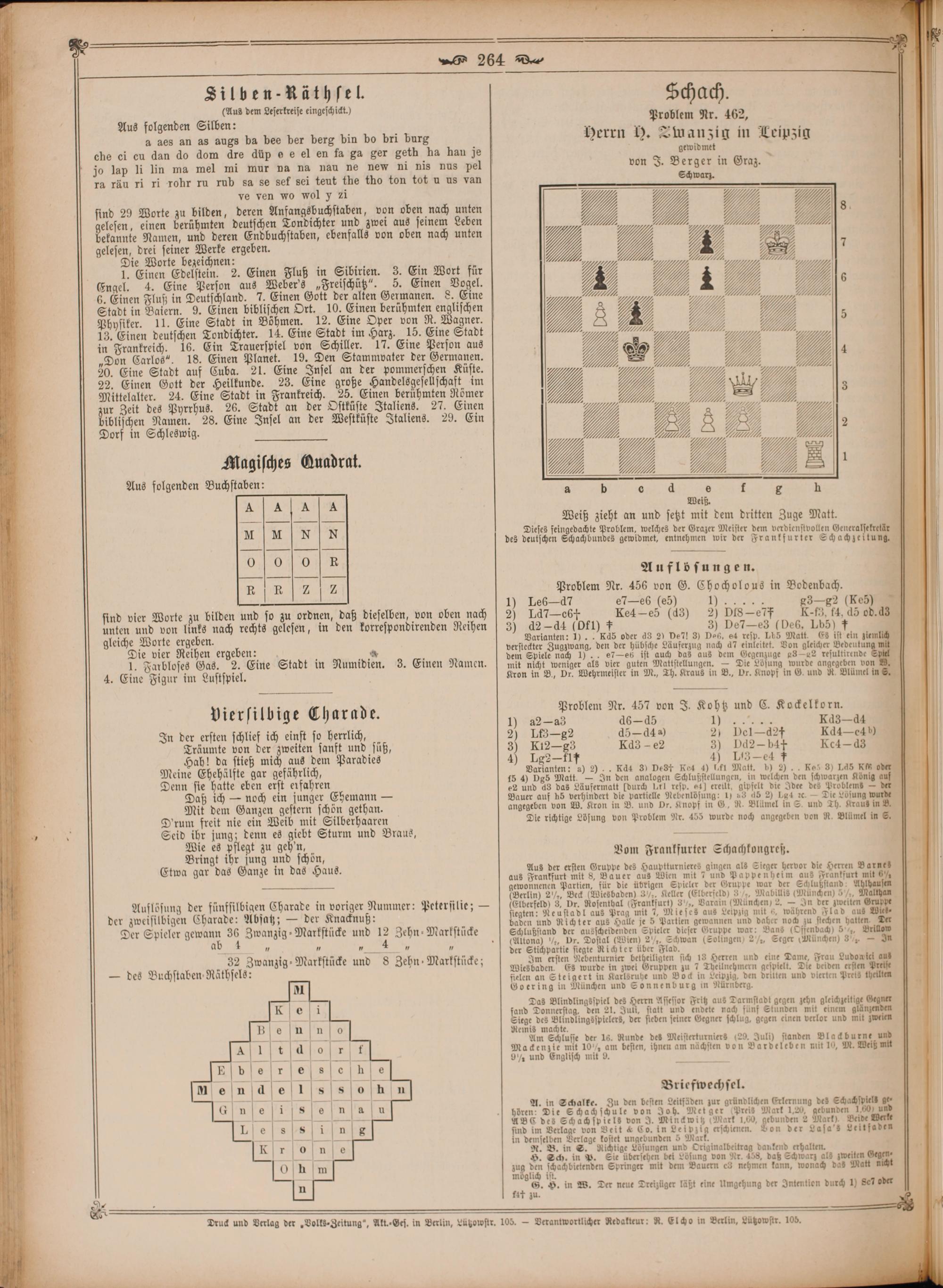 sind 29 Worte zu bilden, deren Anfangsbuchstaben, von oben nach unten elesen, einen berühmten deutschen Tondichter und zwei aus seinem Leben W Namen, und deren Endbuchstaben, ebenfalls von oben nach unten gelesen, drei seiner Werke ergeben. Die Worte bezeichnen:. 5