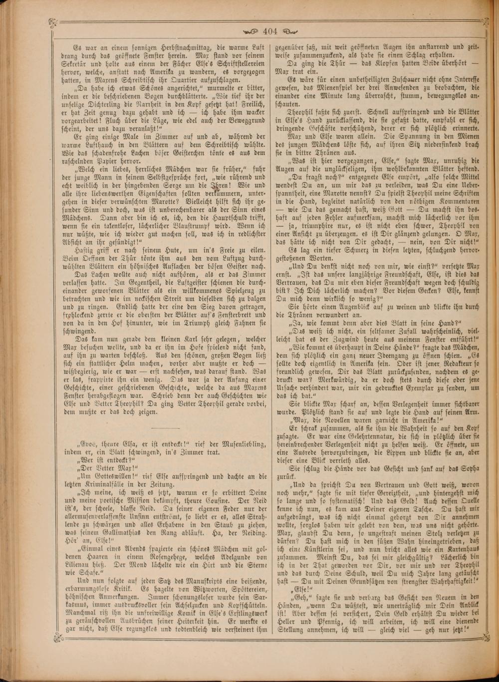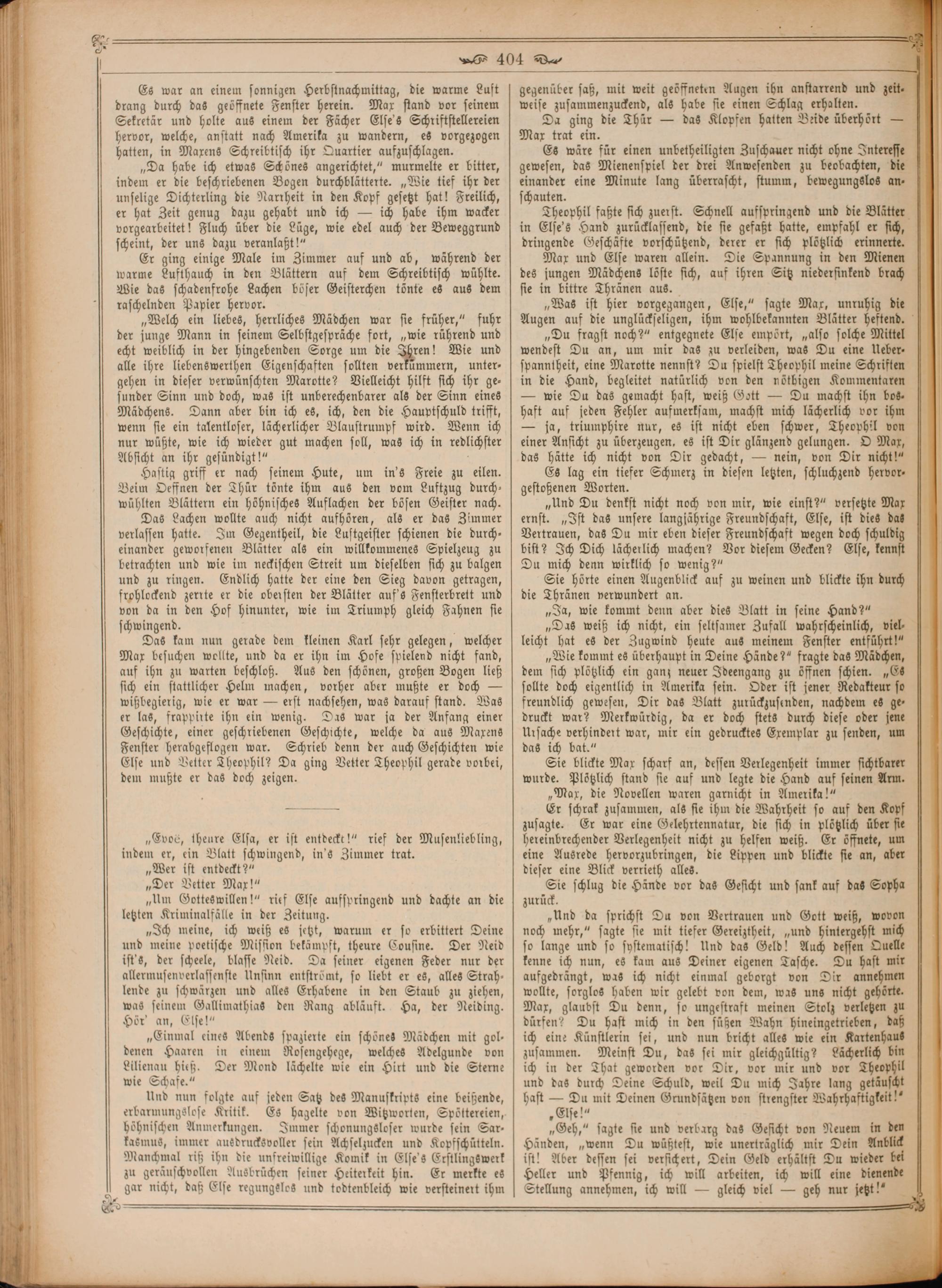 Das kam nun gerade dem kleinen Karl sehr gelegen, welcher Max besuchen wollte, und da er ihn im Hofe spielend nicht fand, auf ihn zu warten beschloß. Aus den schönen, großen Bogen ließ sich ein stattlicher Helm machen, vorher aber mußte er doch— wißbegierig, wie er war— erst nachsehen, was darauf stand. Was er las, frappirte ihn ein wenig. Das war ja der Anfang einer Geschichte, einer geschriebenen Geschichte, welche da aus Maxens Fenster herabgeflogen war. Schrieb denn der auch Geschichten wie Else und Vetter Theophil? Da ging Vetter Theophil gerade vorbei, dem mußte er das doch zeigen.