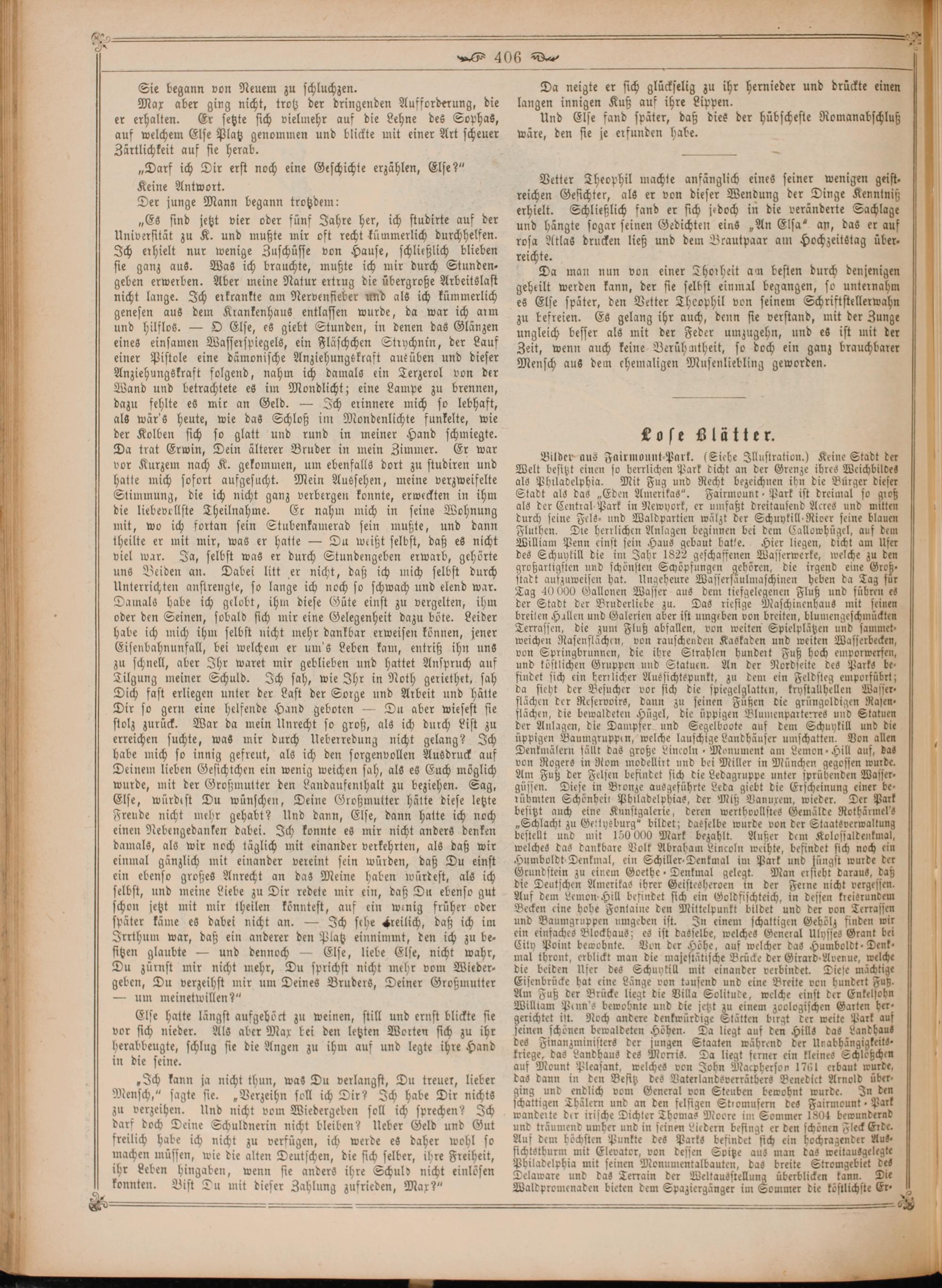 Bilder aus Fairmount-Park.(Siehe Illustration.) Keine Stadt der Welt besitzt einen so herrlichen Park dicht an der Grenze ihres Weichbildes als Philadelphia. Mit Fug und Recht bezeichnen ihn die Bürger dieser Stadt als das„Eden Amerikas“. Fairmount⸗ Park ist dreimal so groß als der Central Park in Newyork, er umfaßt dreitausend Acres und mitten durch seine Fels- und Waldpartien wälzt der Schuykill Rider seine blauen Fluthen. Die herrlichen Anlagen beginnen bei dem Callowhügel, auf dem William Penn einst sein Haus gebaut hatte. Hier liegen, dicht am Ufer des Schuykill die im Jahr 1822 geschaffenen Wasserwerke, welche zu den großartigsten und schönsten Schöpfungen gehören, die irgend eine Groß. stadt aufzuweisen hat. Ungeheure Wassersäulmaschinen heben da Tag für Tag 40000 Gallonen Wasser aus dem tiefgelegenen Fluß und führen es der Stadt der Bruderliebe zu. Das riesige Maschinenhaus mit seinen breiten Hallen und Galerien aber ist umgeben von breiten, blumengeschmückten Terrassen, die zum Fluß abfallen, von weiten Spielplätzen und sammet⸗ weichen Rasenflächen, von rauschenden Kaskaden und weiten Wasserbecken, von Springbrunnen, die ihre Strahlen hundert Fuß hoch emporwerfen, und köstlichen Gruppen und Statuen. An der Nordseite des Parks be— findet sich ein herrlicher Aussichtspunkt, zu dem ein Feldsteg 152 da sieht der Besucher vor sich die spiegelglatten, krystallhellen asser · flächen der Reservoirs, dann zu seinen Füßen die grüngoldigen Rasen⸗ flächen, die bewaldeten Hügel, die üppigen Blumenparterres und Statuen der Anlagen, die Dampfer und Segelboote auf dem Schuykill und die üppigen Baumgruppen, welche lauschige Landhäuser umschatten. Von allen Denkmälern fällt das große Lincoln Monument am Lemon“ Hill auf, das von Rogers in Rom modellirt und bei Miller in München gegossen wurde. Am Fuß der Felsen befindet sich die Ledagruppe unter sprühenden Wasser⸗ güssen. Diese in Bronze ausgeführte Leda giebt die Erscheinung einer be rühmten Schönbeil Philadelphias, der Miß Vanuxem, wieder. Der Park besitzt auch eine Kunstgalerie, deren werthvollstes Gemälde Rothärmel's „Schlacht zu Gettyeburg“ bildet; daeselbe wurde von der Staatsverwaltung bestellt und mit 150 000 Mark bezahlt. Außer dem Kolossaldenkmal, welches das dankbare Volk Abraham Lincoln weihte, befindet sich noch ein Humboldt Denkmal, ein Schiller-Denkmal im Park und 11 wurde der Grundstein zu einem Goethe- Denkmal gelegt. Man ersieht daraus, daß die Deutschen Amerikas ihrer Geistesheroen in der Ferne nicht vergessen. Auf dem Lemon Hill befindet sich ein Goldfischteich, in dessen kreisrundem Becken eine hohe Fontaine den Mittelpunkt bildet und der von Terrassen und Baumgruppen umgeben ist. In einem schattigen Gehölz finden wir ein einfaches Blockhaus; es ist dasselbe, welches General Ulysses Grant bei City Point bewohnte. Von der Höhe, auf welcher das Humboldt Denk ⸗ mal thront, erblickt man die majestätische Brücke der Girard Avenue, welche die beiden Ufer des Schuykill mit einander verbindet. Diese mächti Eisenbrücke hat eine Länge von tausend und eine Breite von hundert Fuß. Am Fuß der Brücke liegt die Villa Solitude, welche einst der Enkelsohn William Penn's bewohnte und die jetzt zu einem zoologischen Garten her: erichtet ist. Noch andere denkwürdige Stätten birgt der weite Park auf 2 schönen bewaldeten Höhen. Da liegt auf den Hills das Landhaus des Finanzministers der jungen Staaten während der Unabhängigkeits⸗ kriege, das Landhaus des Morris. Da liegt ferner ein kleines Schlößchen auf Mount Pleasant, welches von John Macpherson 1761 erbaut wurde, das dann in den Besitz des Vaterlandsverräthers Benedict Arnold über⸗ ging und endlich vom General von Steuben bewohnt wurde. In den schattigen Thälern und an den felsigen Stromufern des Fairmount⸗ Park wanderte der irische Dichter Thomas Moore im Sommer 1804 bewundernd und träumend umher und in seinen Liedern besingt er den schöͤnen Fleck Erde. Auf dem höchsten Punkte des Parks befindet sich ein hochragender Aus⸗ sichtstburm mit Elevator, von dessen Spitze aus man das weitausgelegle Philadelphia mit seinen Monumentalbauten, das breite Stromgebiet des Delaware und das Terrain der Weltausstellung überblicken kann. Die