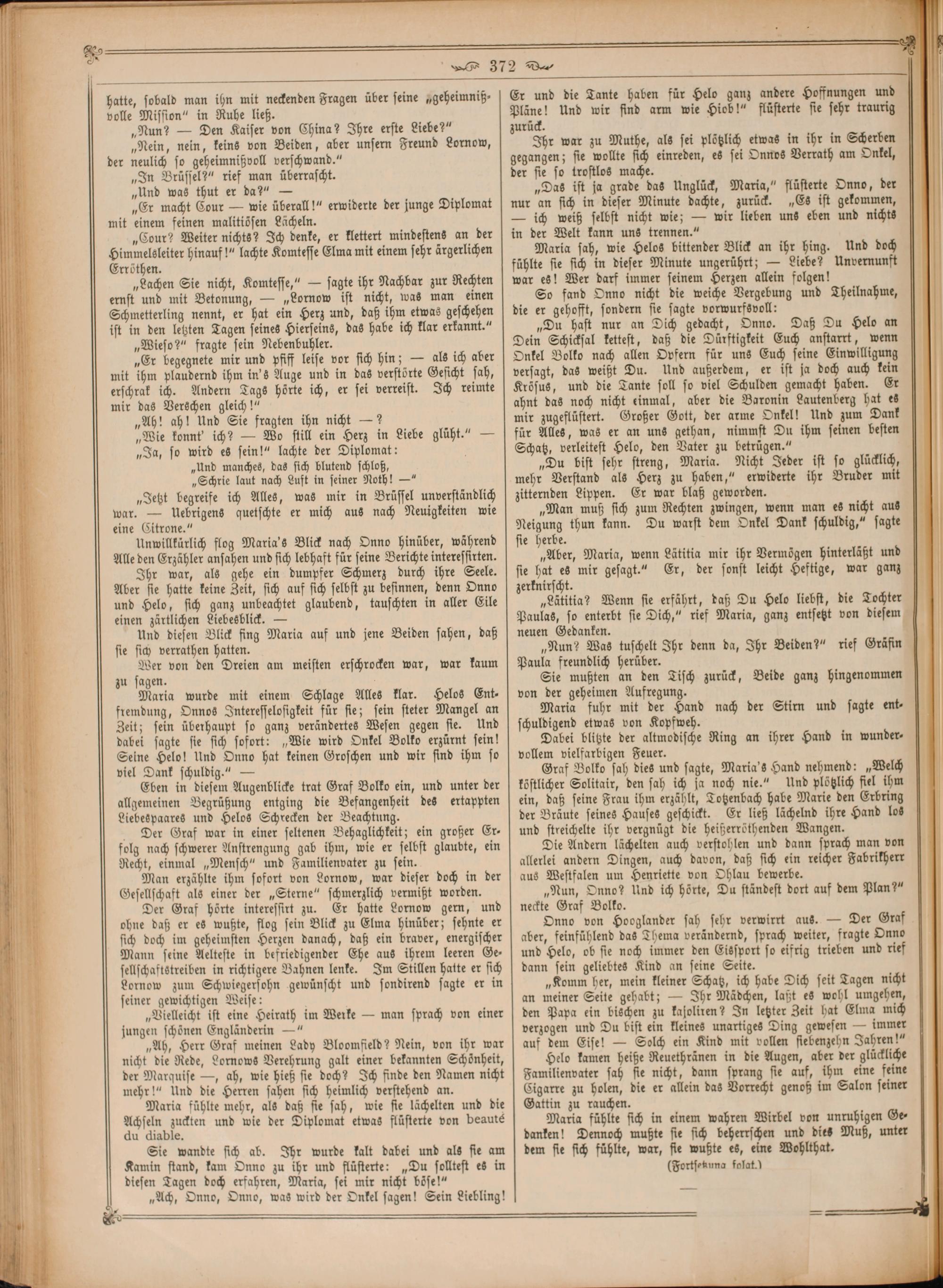 Graf Bolko sah dies und sagte, Maria's Hand nehmend:„Welch köstlicher Solitair, den sah ich ja noch nie.“ Und plötzlich fiel ihm ein, daß seine Frau ihm erzählt, Totzenbach habe Marie den Erbring der Bräute seines Hauses geschickt. Er ließ lächelnd ihre Hand los und streichelte ihr vergnügt die heißerröthenden Wangen.