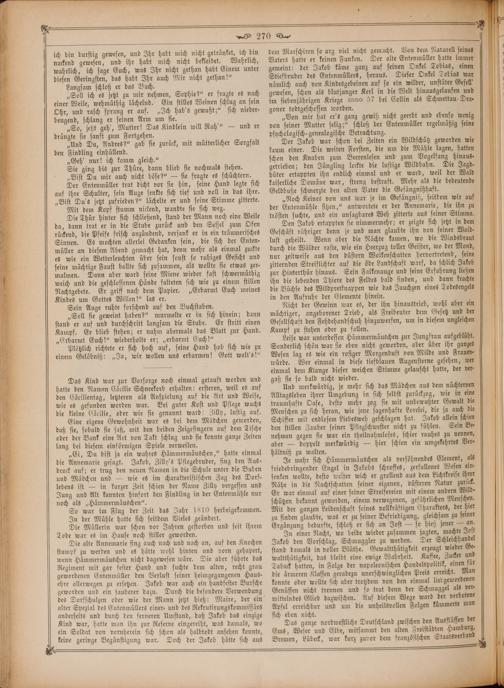 Der Jakob war schon bei Zeiten ein Wildschütz geworden wie kaum einer. Die weiten Forsten, die um die Mühle lagen, hatten schon den Knaben zum Beerenlesen und zum Vogelfang hinaus⸗ getrieben; den Jüngling lockte die lustige Wildbahn. Die Jagd-. hüter ertappten ihn endlich einmal und er ward, weil der Wald kaiserliche Domäne war, streng bestraft. Mehr als die bedeutende Geldbuße schmerzte den alten Vater die Gefängnißhaft.