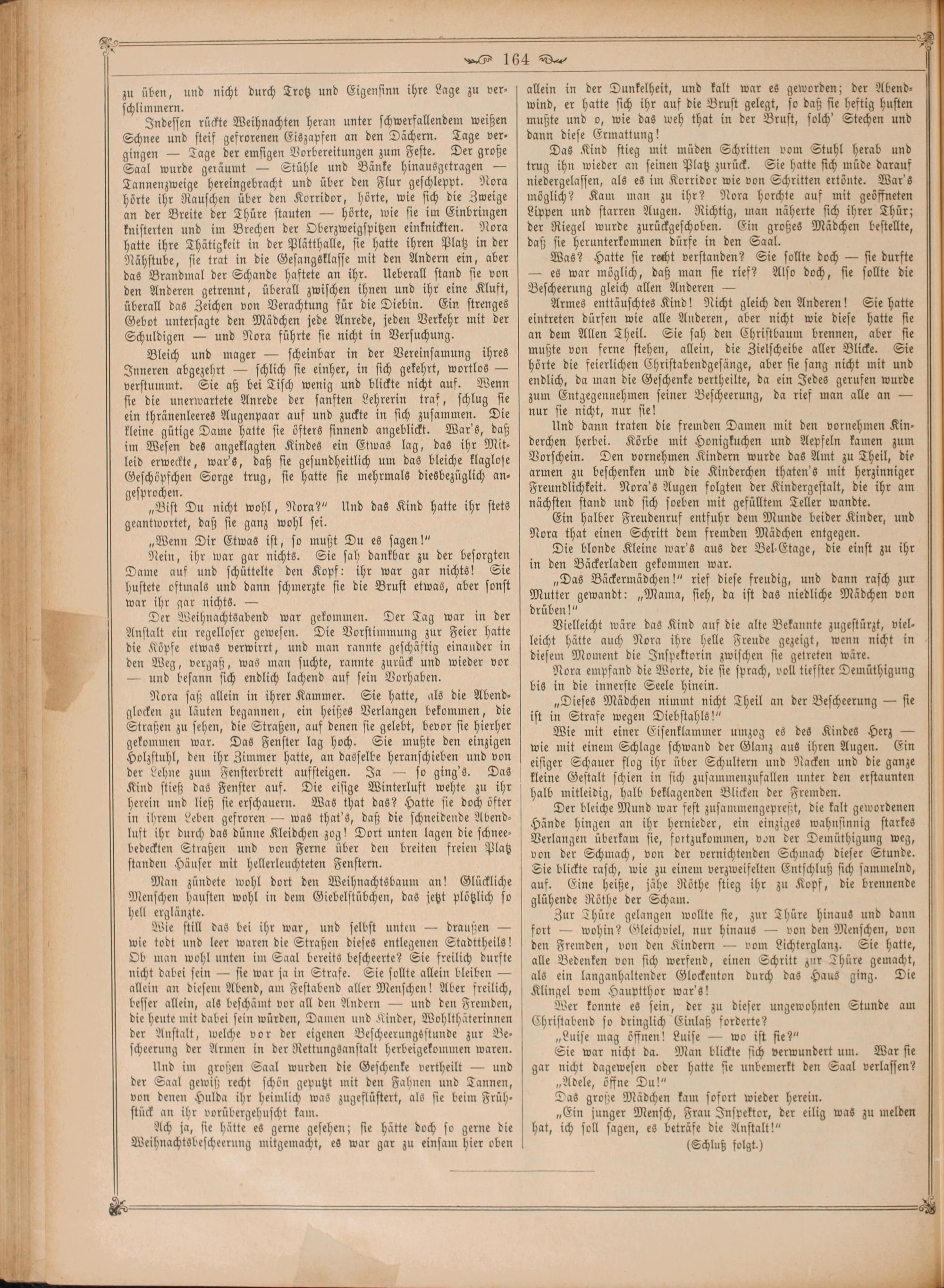 Indessen rückte Weihnachten heran unter schwerfallendem weißen Schnee und steif gefrorenen Eiszapfen an den Dächern. Tage ver— gingen— Tage der emsigen Vorbereitungen zum Feste. Der große Saal wurde geräumt— Stühle und Bänke hinausgetragen— Tannenzweige hereingebracht und über den Flur geschleppt. Nora hörte ihr Rauschen über den Korridor, hörte, wie sich die Zweige an der Breite der Thüre stauten— hörte, wie sie im Einbringen knisterten und im Brechen der Oberzweigspitzen einknickten. Nora hatte ihre Thätigkeit in der Plätthalle, sie hatte ihren Platz in der Nähstube, sie trat in die Gesangsklasse mit den Andern ein, aber das Brandmal der Schande haftete an ihr. Ueberall stand sie von den Anderen getrennt, überall zwischen ihnen und ihr eine Kluft, überall das Zeichen von Verachtung für die Diebin. Ein strenges Gebot untersagte den Mädchen jede Anrede, jeden Verkehr mit der Schuldigen— und Nora führte sie nicht in Versuchung.