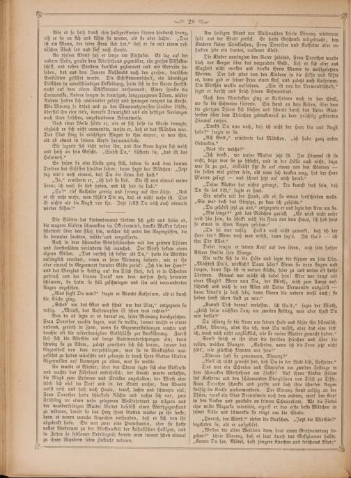 Am heiligen Abend vor Weihnachten kehrte Vincenz wiederum spät aus der Stadt zurück. Er hatte Geschenke mitgebracht, den Kindern kleine Spielsachen, Frau Dorothee und Kathrine aber er⸗ hielten jede ein buntes, wollenes Kleid. 2
