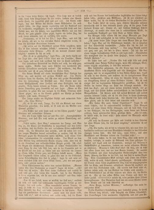 „Nichts weiter, Herr Guy,“ antwortete der Junge, und Guy fing an, die Sauce mit Brodstücken so impertinent aus dem Teller zu wischen, daß die Gräfin ihn mit verfinsterter Stirn nachdrücklich ansah. Ja, die Situation war peinlich, und ich nahm mir vor, den jungen Menschen darauf aufmerksam zu machen, daß ich sein Betragen gegen die Großmutter weder schicklich, noch einem fried— lichen Zusammenleben für ersprießlich erachte. Der Abend an dem seine Wärme karg entsendenden Kamin verging nicht, ohne daß ich in ein Kreuzfeuer von wissenschaftlichen Fragen gerieth. Ich erhob die Augen mit schüchternem Staunen ob solcher Gelehrsamkeit bei einer Frau, sie aber fuhr kühl fort, mir in der Geometrie und in der Physik auf den Zahn zu fühlen und mir schließlich ein Zimmer zu öffnen, dessen Wände ganz mit Büchern bedeckt waren.„Wenn Sie Langeweile fühlen sollten, so gehen Sie nur in die Bibliothek, meine Arbeitsstunden hier sind so gelegt,“ sagte sie und wies auf einen einfachen Tisch und einem Stuhl davor,„daß wir uns gegen— seitig nicht geniren werden.“ 5
