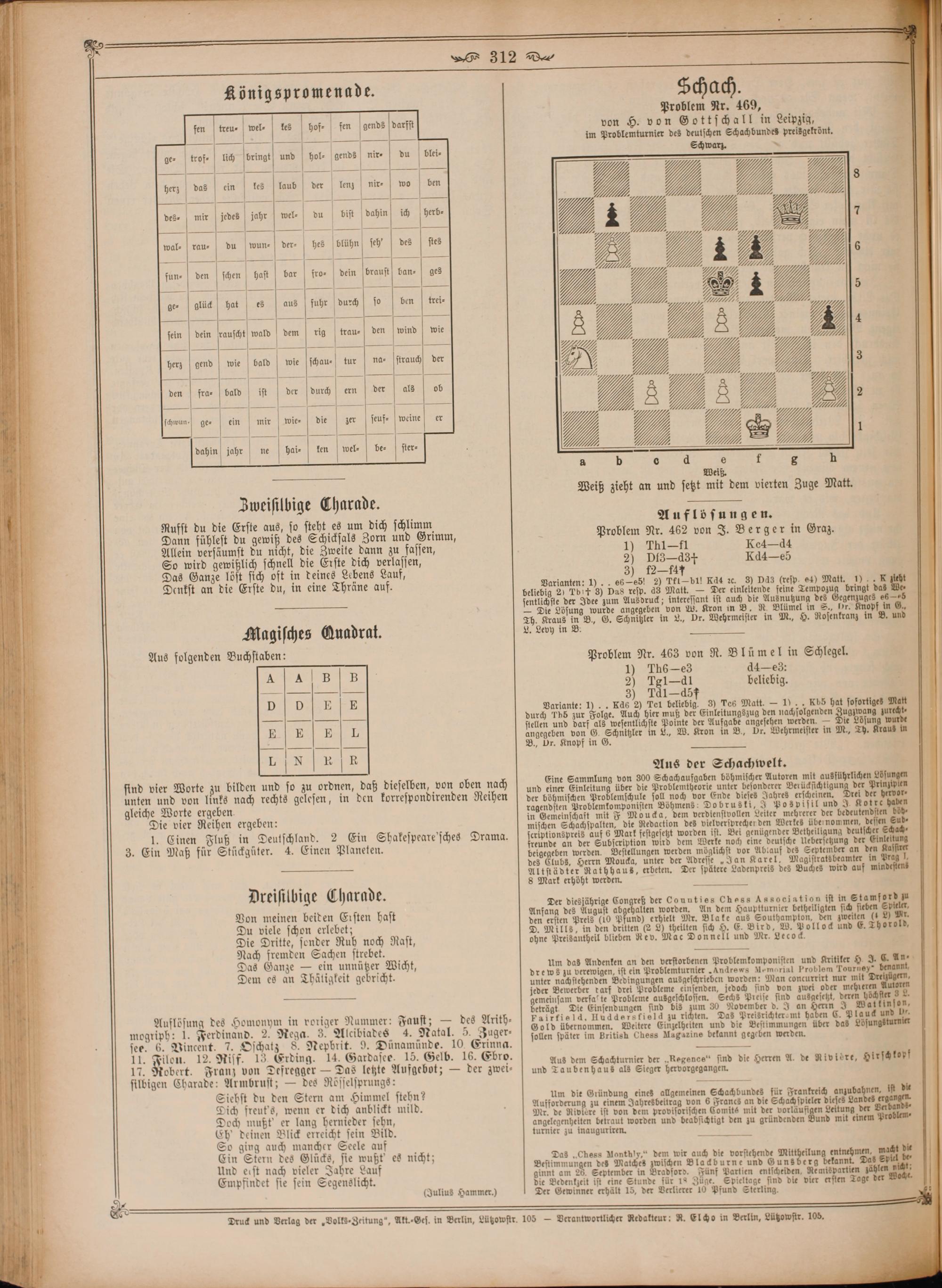 Th, Kraus in B., G. Schnitzler in L., Dr. Wehrmeister in M., H. Rosenkranz in B. un L. Levy in B. 5 5 Problem Nr. 463 von R. Blümel in Schlegel. 1