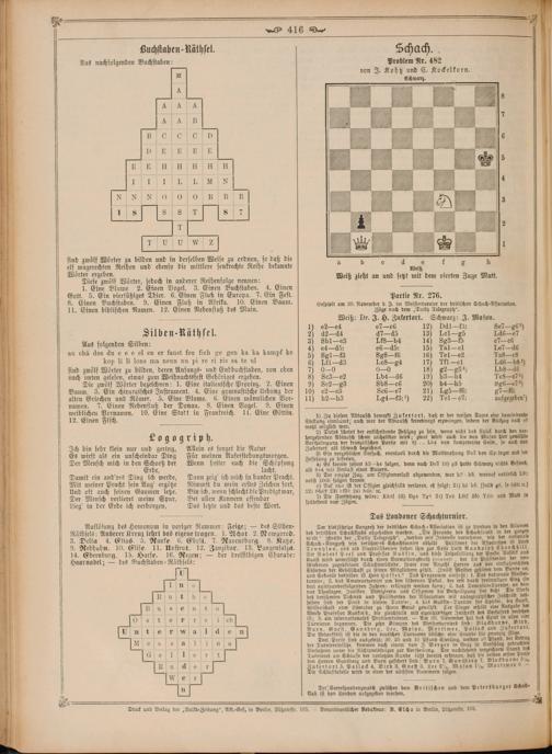 Der dles jährige Kongreß der britischen Schach- Association ist zu London in den Näumen des brilischen Schachklubs abgehalten worden.„Die Freunde des Schachspiels in der 1 Welt.“ schreibt der„Daily Telegraph“,„werden mit Interesse vernehmen, wie der nastonale Schach-Kongreß sein berühmzes Schachtianier abhält Präsidert der Association ii Lord Tennyson, und als Vicepräsidenten stehen ihm zur Seite Lord Randolph Church bill. Sir Robert Peel und 4 Ruskin, und diese Tripelallianz der Poesie, Politik und Kunst wird unterstützt durch einen Verwaltungsrath(auneise, der die Präfidenten der ver- schiedenen zugedörigen Schachverbände, sowie eine Anzahl Herren aus den einflußreichsten Ständen der Gesellschaft zu seinen Mitgliedern zählt. Zwölf Meister gehören dem Bunde an, und Sekretär desselben ist Herr Hoffer.“ Das Programm umfaßt: 1. Das nationale Meister⸗ turnier; 2. das Amateurturnler um den sildernen Pokal, der erst durch dreimaligen Sleg(in drei aufeinonderfolgenden Jahren erlämpft werden lann; 3. das Tennpfon⸗Turnier. an nur Theologen, Juristen. Medizinern und Offifieren die Betheiligung frei fleht Die Werle des berühmsen Dichters und Präsidenten der Association mit autographischer Inschrift des⸗ selben sind der Preis in diesem Turnser; 4. das Ruskin-Turnier für Spieler die Kunst, Wissenschaft oder Literatur 7 ihrem Beruf gewählt. Der Sieger erhält eine Ausgabe der Werke Professor Ruskin's, dle gleichfalls mit eigenhändiger Inschrift des 1 versehen ist; 5. ein internationales Problemturnter.— Am 30. Novemder bat das Spiel in allen vier Turnieren begonnen. Die zehn Kämpen des Meisterturniers find: Blacburne, Bird, Burn. Gnest, Gunsberg. Lee. Mason, Mortimer, Polloc und Zutkertort. Die Bedenlfrist ist die in den deutschen Turnieren übliche: eine Stunde für zwanzig 2 Drei Preise sind ausgesetzt: 30, 20 und 10 Pfund Sterling, weitere 3 der der Turniereinsätze, kommen nach einem von J Berger in Graz in Vorschlag gebrachten Verfahren unter die Nichtpreisträger zur Vertbeilung. Der nach sstehend verzeichnete Stand des Turnieres am Schlusse der vorletzten Runde läßt bereits erkennen, daß die beiden ersten reise den Herren Gunsberg und Burn gesichert sind: Burn 7. Gunsberg 7, Blachburne 57,1 utertort 5, Pollod 4, Bird 3, Gnest 3, Lee 2½ Mason 1½ Mortimer 0.— ie Schlusttabelle wird in einer der nächsten Nummern folgen.