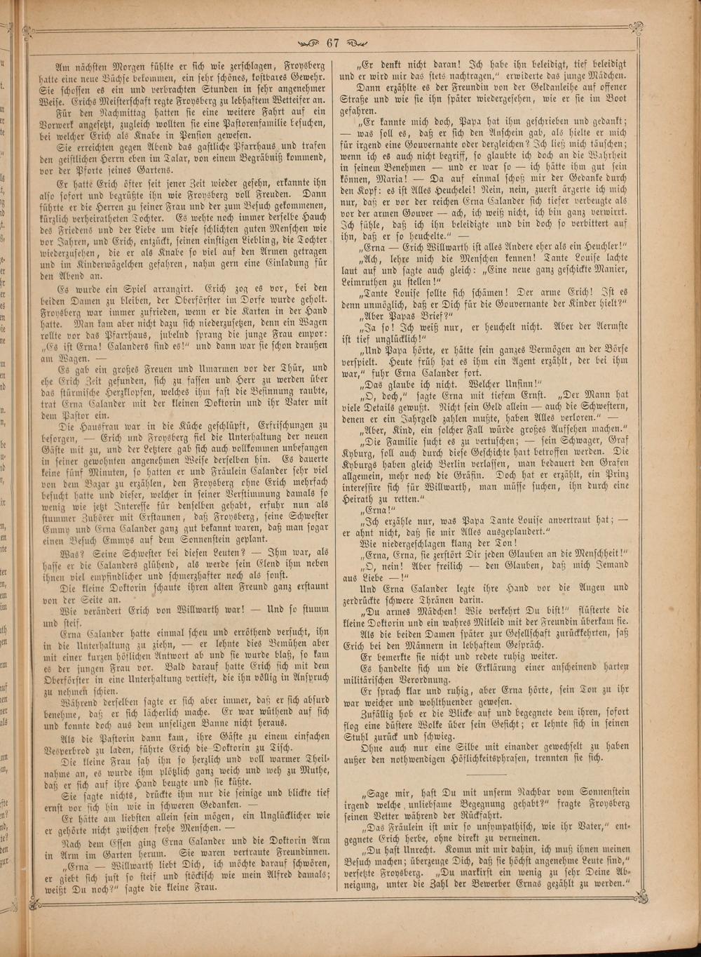 „Er kannte mich doch, Papa hat ihm geschrieben und gedankt; — was soll es, daß er sich den Anschein gab, als hielte er mich für irgend eine Gouvernante oder dergleichen? Ich ließ mich täuschen; wenn ich es auch nicht begriff, so glaubte ich doch an die Wahrheit in seinem Benehmen— und er war so— ich hätte ihm gut sein können, Maria!— Da auf einmal schoß mir der Gedanke durch den Kopf: es ist Alles Heuchelei! Nein, nein, zuerst ärgerte ich mich nur, daß er vor der reichen Erna Calander sich tiefer verbeugte als vor der armen Gouver— ach, ich weiß nicht, ich bin ganz verwirrt. Ich fühle, daß ich ihn beleidigte und bin doch so verbittert auf ihn, daß er so heuchelte.“—