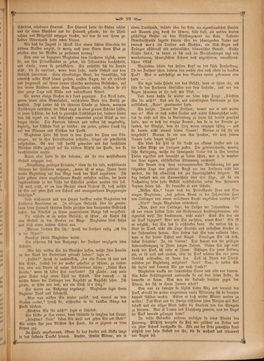 Leise erschauernd und von Herzen dankbar nahm Magdalene des Freiherrn Anerbieten an. In eifrigem Gespräch über die gemein⸗ same ferne Heimath schritten Beide zwischen dem knospenden Gesträuch dahin, des Anlasses zu ihrem gemeinsamen Gange fast vergessend.