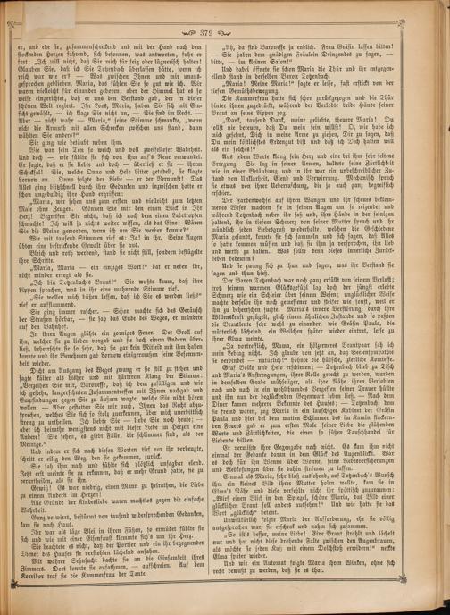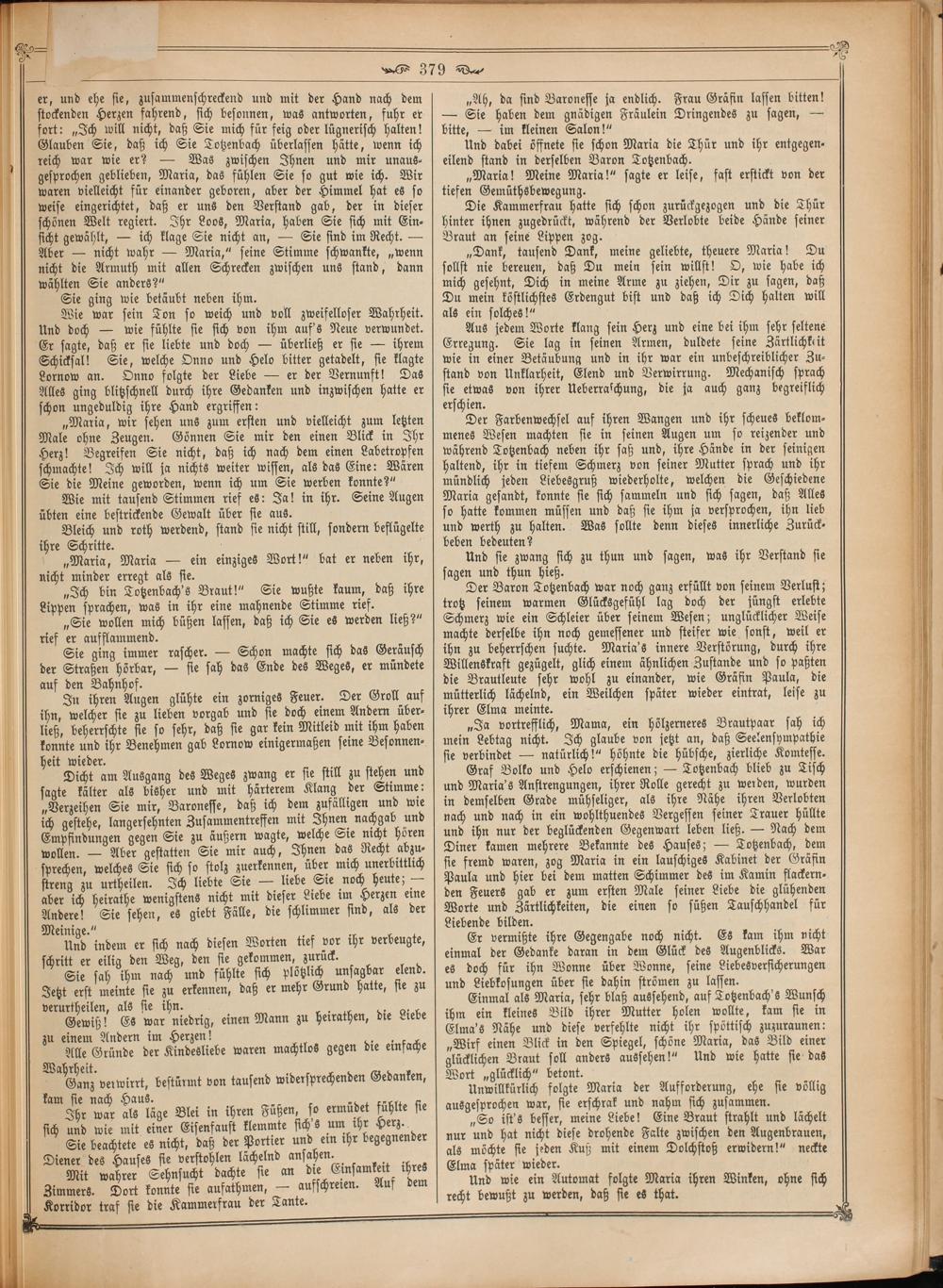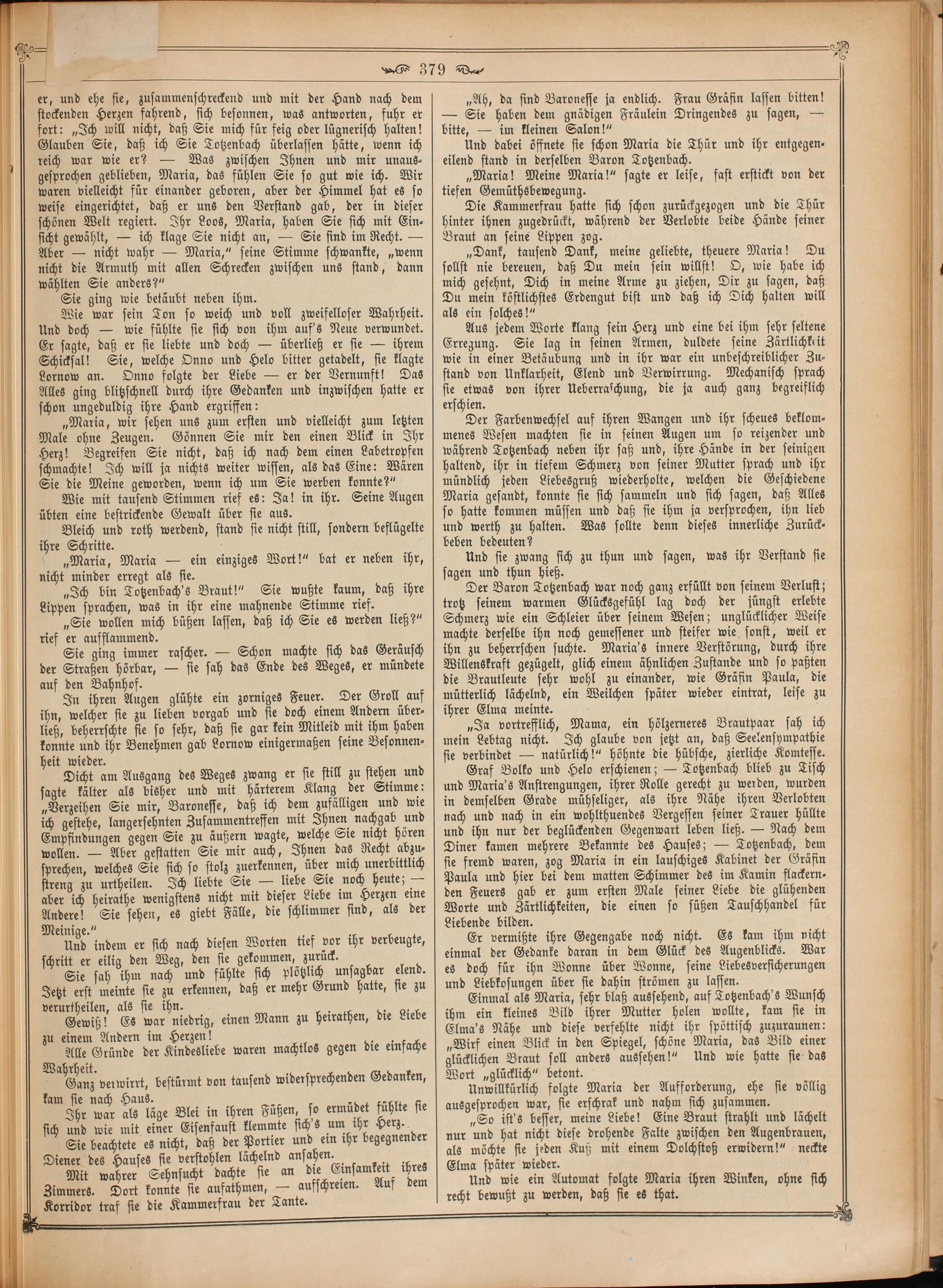 Einmal als Maria, sehr blaß aussehend, auf Totzenbach's Wunsch ihm ein kleines Bild ihrer Mutter holen wollte, kam sie in Elma's Nähe und diese verfehlte nicht ihr spöttisch zuzuraunen: „Wirf einen Blick in den Spiegel, schöne Maria, das Bild einer glücklichen Braut soll anders aussehen!“ Und wie hatte sie das Wort„glücklich“ betont.
