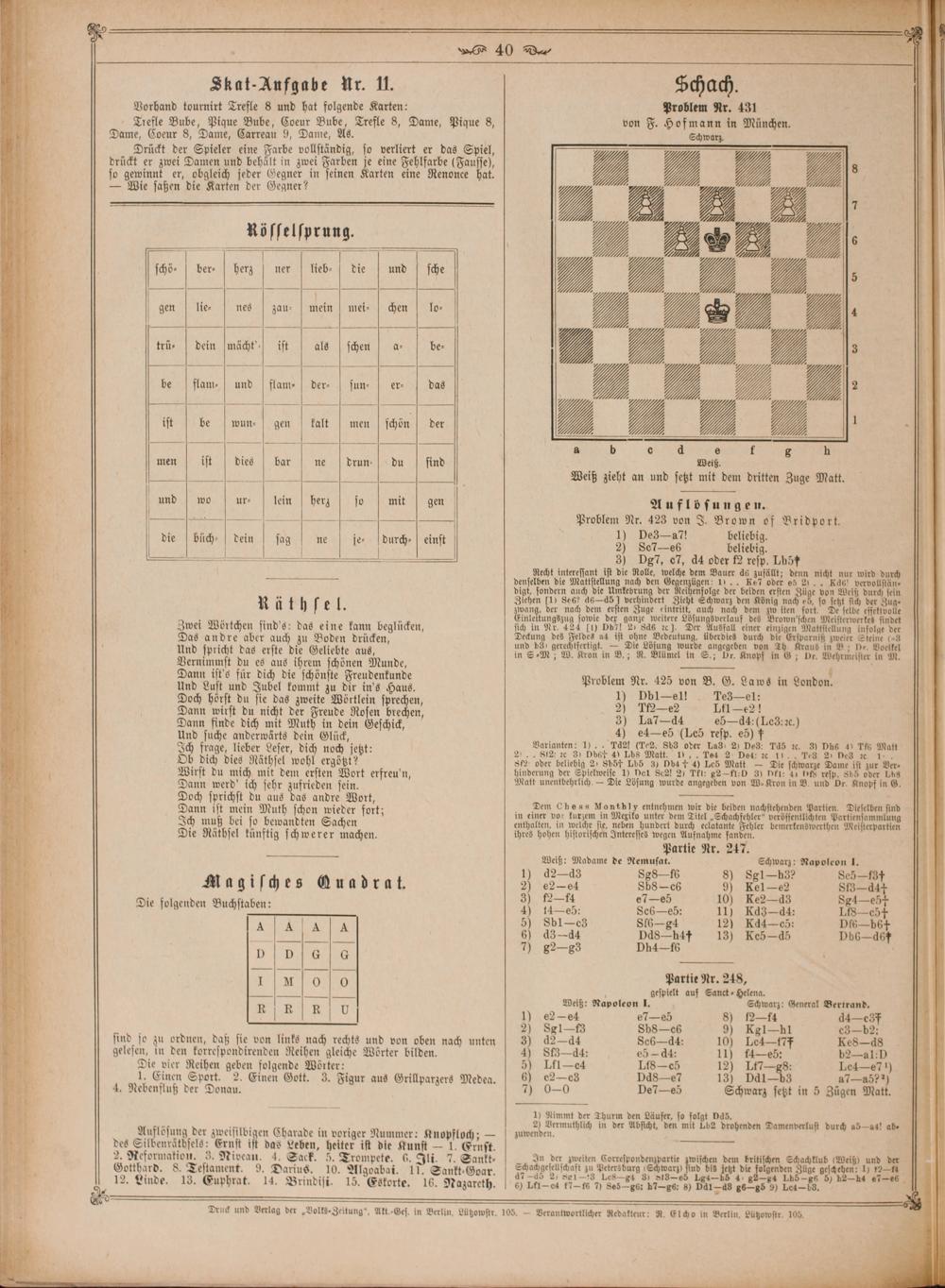 g 42 G. 0 Und Lust und Jubel kommt zu dir in's Haus. 8 5 1 9 8 0 1 bordan. Doch hoͤrst du sie das zweite Wöttlein sprechen, 9 1¹2 205 1 7 21 Dann wirst du nicht der Freude Rosen brechen, 3) I. 1744 544. Les: Dann finde dich mit Muth in dein Geschick,) La ö da:(Les: ac.) And suche anderwärts dein Glück, Varianten: 1). 7 5 3 5 e Td5 zꝛc. 3) Dhe 4 T. Matt Ich frage, lieber Leser, dich noch jetzt:. 82, 20 8) Dber 4 Ibs Matt. 1),. Tel 2. Det ac 1b. eg 2 Des 2c 1. Ob dich dies Räthsel wohl ergößte 90 oder wee 10 n 117 1 1045 55 1 re lä auh dun 118 W— 2 U e 0 1 da öh ehe gur ee 15995 erfreu n, Matt unentbehrlich— Pie Losang wurde angegeben von W. Kron i in B. e warf G. Doch sprichst du aus das andre Wort, Di Month! ˖ die beid d t Dieselb U Dann ist mein Muth schon wieder sott; in bee in Mezilo.. Tie Lecce bastelglen Barde bal Ich muß bei so bewandten Sachen enthalten, in welche sie, neben hundert durch eclalante 12 5 bemerkenswerthen Meisterpartien Die Räthsel künftig schwerer machen. ihres hohen historischen Interesses 70 1 7 artie Nr. Weiß: Madame de Remusat. Schwarz: Napoleon 1. 1 1) d2—d3 8g8 16 8) Sg1—hb32 Se5 137 Magisches Quadrat. 20 e2—e4 Sbs e 9) Kel—e2 81844 e fallenden B bun: 39 1214 7e 10) Ke2-—d3 8g4-eß ie folgenden Buchstaben: 4 14 eb: Sc eb: 11) Kd d: LIS 65 . 5) Sb1-c 816—g4 12) Kdd cd: 16—b6f 6) d3—d4 Dds—h4f 13) Keß-d Db6-déf D D 7 7) g2—g3 Dh4-f6 5 „ 5 5 Partie Nr. 248 . g eee a gespielt auf e ——— 9 Weiß: Napoleon J. Schwarz: General Bertrand. 8 R R R U) eee 1e 9 2911 44857 8 2) 8g SbSs c 9 91—b1 3-b: 948 sind so zu ordnen, daß sie von links nach rechts und von oben nach unten 3) d2— da Se- d: 10) Lea- tf Kes—-dSs 9 N gelesen, in den korrespondirenden Reihen gleiche Wörter bilden. 4) Sf3- da: 5- da: 11) fA4—ez: b2—al:D N K Die vier Reihen geben folgende Wörter: 00 LI—04 IS- eõ 12) L7—g8: Le4—e7!) 3 1. Einen Sport. 2. Einen Gott. 3. Figur aus Grillparzers Medea. 6) e263 DdS—e7 13) Dadl—b3 af-aöf!) 17 4. Nebenfluß der Donau. 00 De7-es Schwarz setzt in 5 Zügen Matt. 75 fluß 4 5) Nimmt der Thurm den Läufer, so folgt Das. . 2) Vermuthlich in der Absicht, den mit 1b drohenden Damenverlust durch aß asl ab- 1 Auflösung der zweisilbigen Charade in voriger Nummer: Knopfloch;— zuwenden. e b 1 5 e. ist das 80 heiter ist die Kunst— 1. Ernst. 5 2. Reformatiou ivean. 4. Sack. 5. Trompete. 6. Ili. 7. Sankt⸗ In der zweiten Correspondenzpartie zwischen dem britischen Schachklub(Weiß) und der . Gotthard. 8. Testament. 9. Darius. 10. Algoabai. ii. End Gbr N 0 e N 12. Linde. 13. Euphrat. 14. Brindisi. 15. Eskorte. 16. Nazareth. 6) Lti-e fits 7) Se5 86: hi- ger 8) Dal- dg 8685) Lell. 2