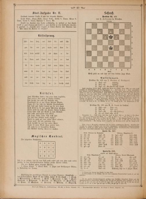 ü g* 40.. 9 Skat-Aufgabe Ur. II. Schach. a Vorhand tournirt Trefle 8 und hat folgende Karten: Problem Nr. 431 5 Trefle Bube, Pique Bube, Coeur Bube, Trefle 8, Dame, Pique 8, von F. Hofmann in München. Dame, Coeur 8, Dame, Carreau 9, Dame, As. ar —