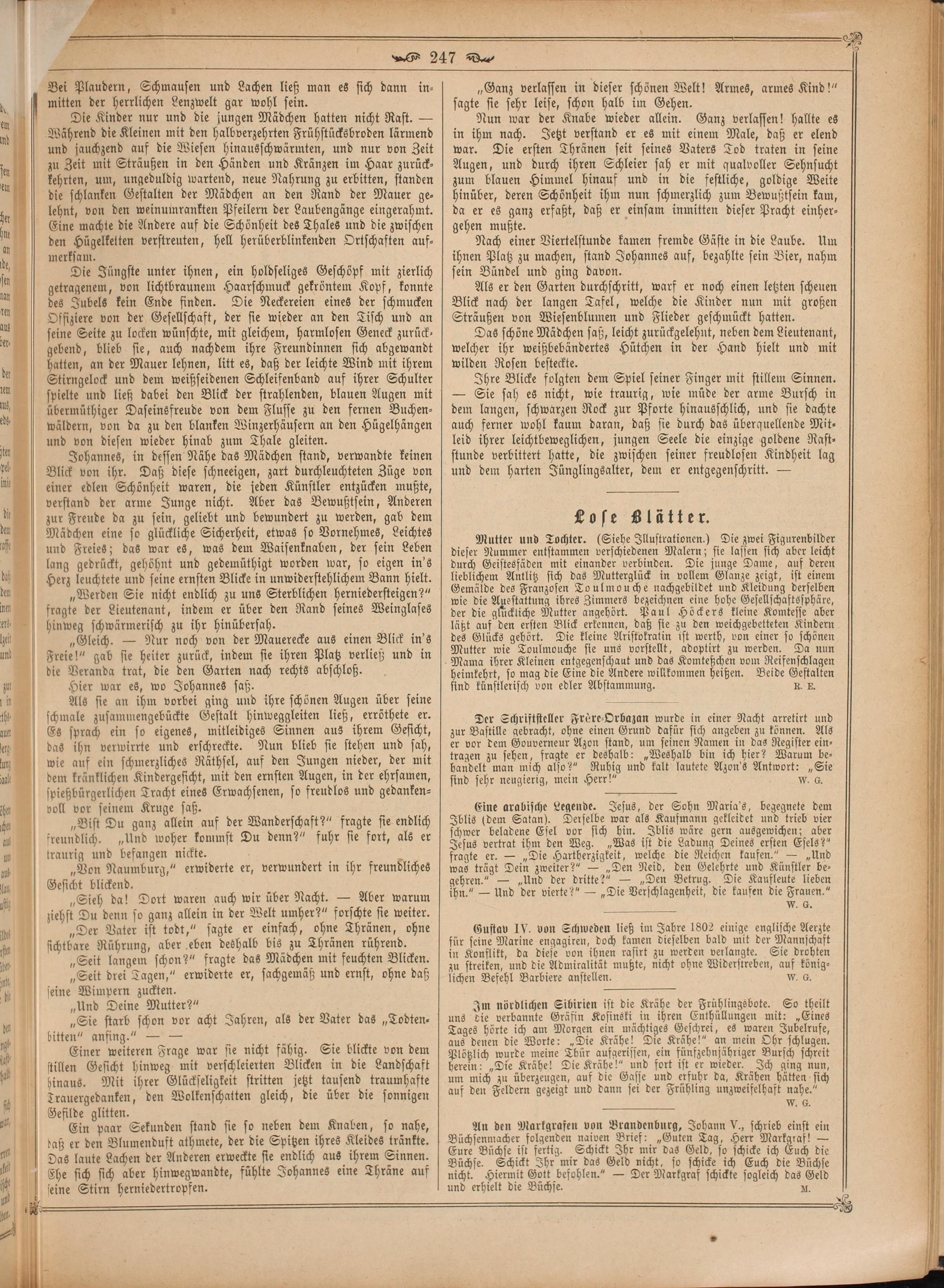 Ein paar Sekunden stand sie so neben dem Knaben, so nahe, daß er den Blumenduft athmete, der die Spitzen ihres Kleides tränkte. Das laute Lachen der Anderen erweckte sie endlich aus ihrem Sinnen. Che sich sich aber hinwegwandte, fühlte Johannes eine Thräne auf