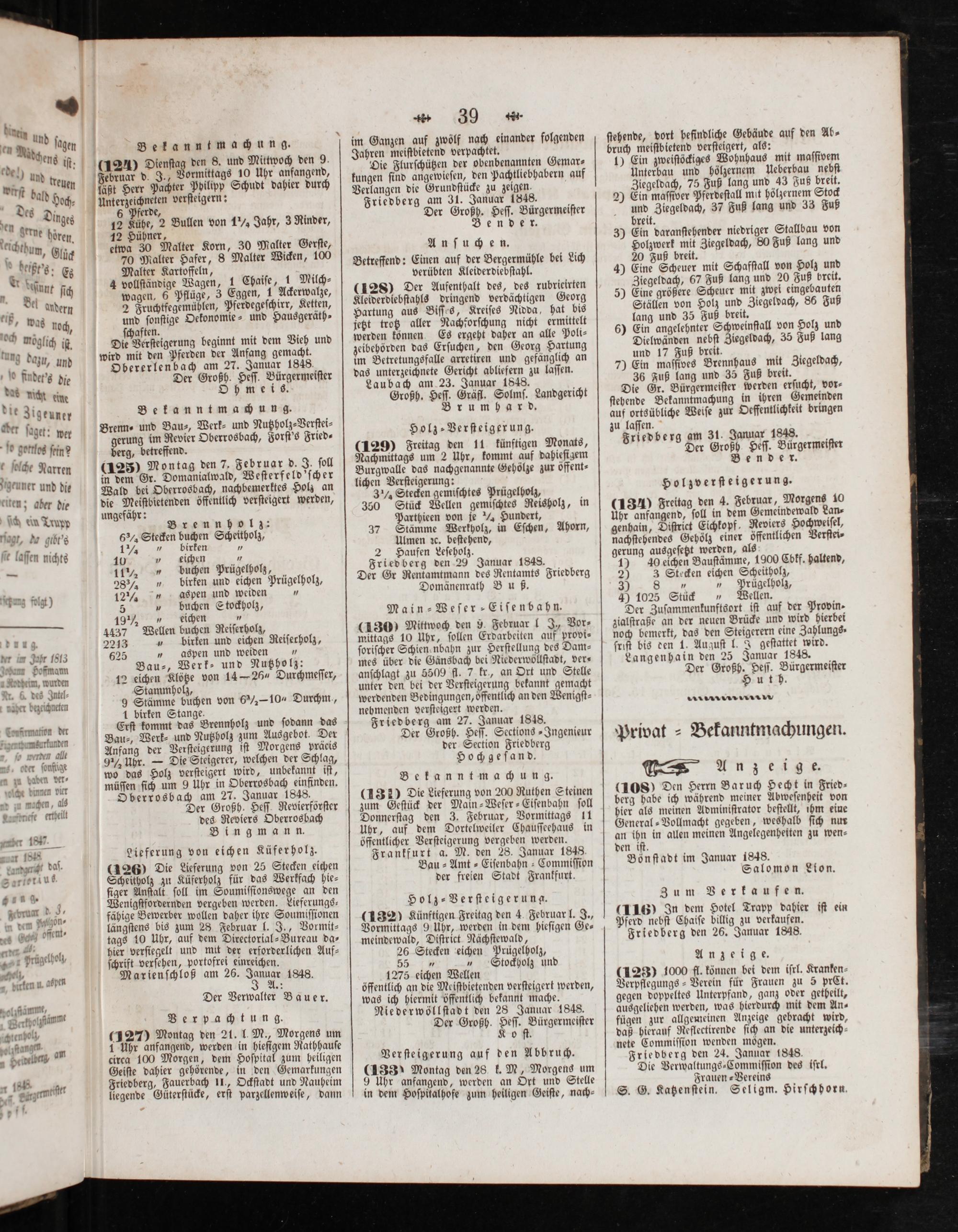 Ulmen ꝛc. beſtehend, 2 Haufen Leſeholz. Friedberg den 29 Januar 1848. Der Gr Rentamtmann des Rentamts Friedberg Domänenrath Bu ß.