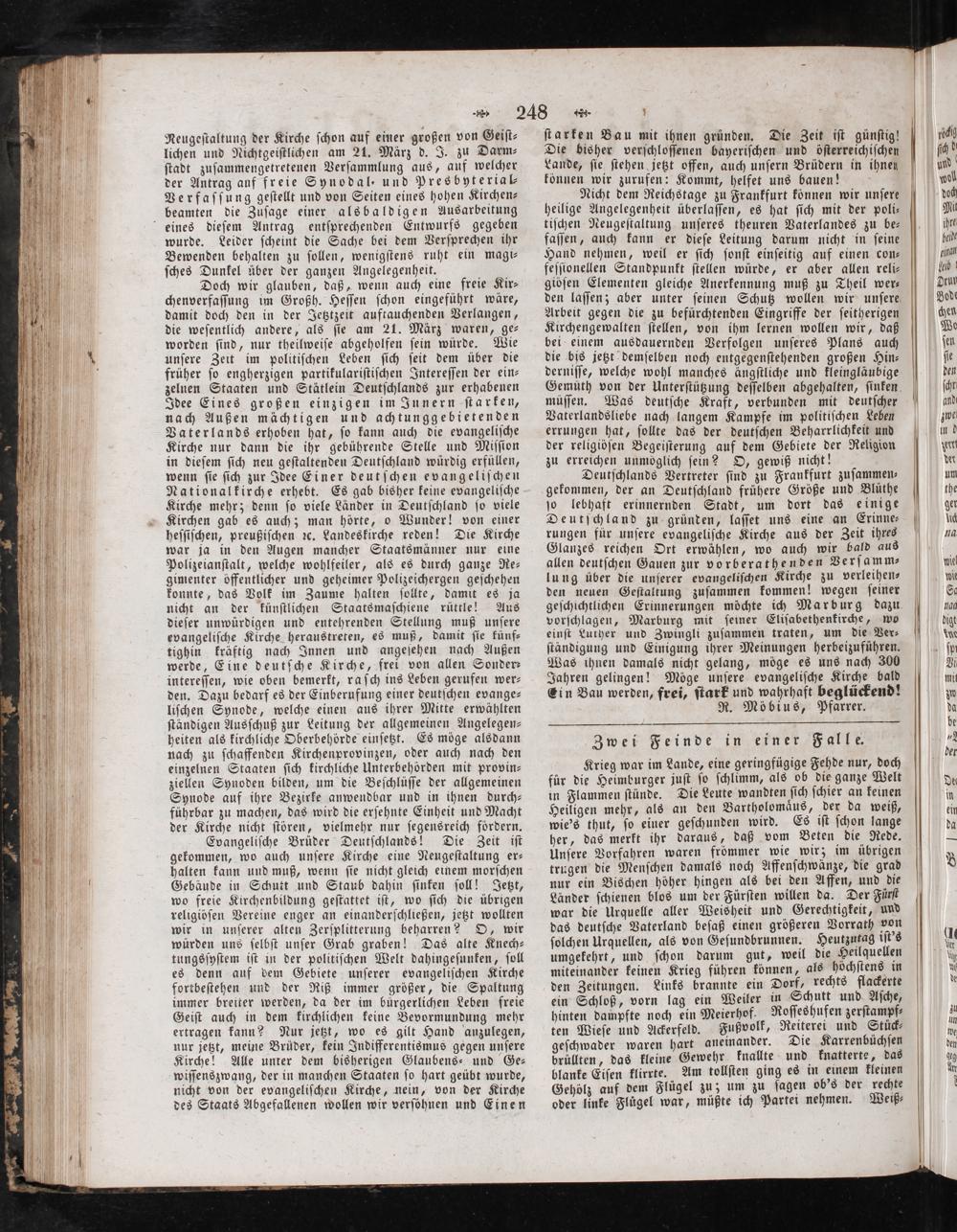 müſſen. Was deutſche Kraft, verbunden mit deutſcher Vaterlandsliebe nach langem Kampfe im politiſchen Leben errungen hat, ſollte das der deutſchen Beharrlichkeit und der religibſen Begeiſterung auf dem Gebiete der Religion zu erreichen unmoglich ſein? O, gewiß nicht! Deutſchlands Vertreter ſind zu Frankfurt zuſammen— gekommen, der an Deutſchland frühere Größe und Blüthe ſo lebhaft erinnernden Stadt, um dort das einige Deutſchland zu gründen, laſſet uns eine an Erinne— rungen für unſere evangeliſche Kirche aus der Zeit ihres Glanzes reichen Ort erwählen, wo auch wir bald aus allen deutſchen Gauen zur vorberathenden Verſamm⸗ lung über die unſerer evangeliſchen Kirche zu verleihen⸗ den neuen Geſtaltung zuſammen kommen! wegen ſeiner geſchichtlichen Erinnerungen möchte ich Marburg dazu vorſchlagen, Marburg mit ſeiner Eliſabethenkirche, wo einſt Luther und Zwingli zuſammen traten, um die Ver⸗ ſtändigung und Einigung ihrer Meinungen herbeizuführen. Was ihnen damals nicht gelang, möge es uns nach 300 Jahren gelingen! Möge unſere evangeliſche Kirche bald Ein Bau werden, frei, ſtark und wahrhaft beglückend! R. Möbius, Pfarrer.
