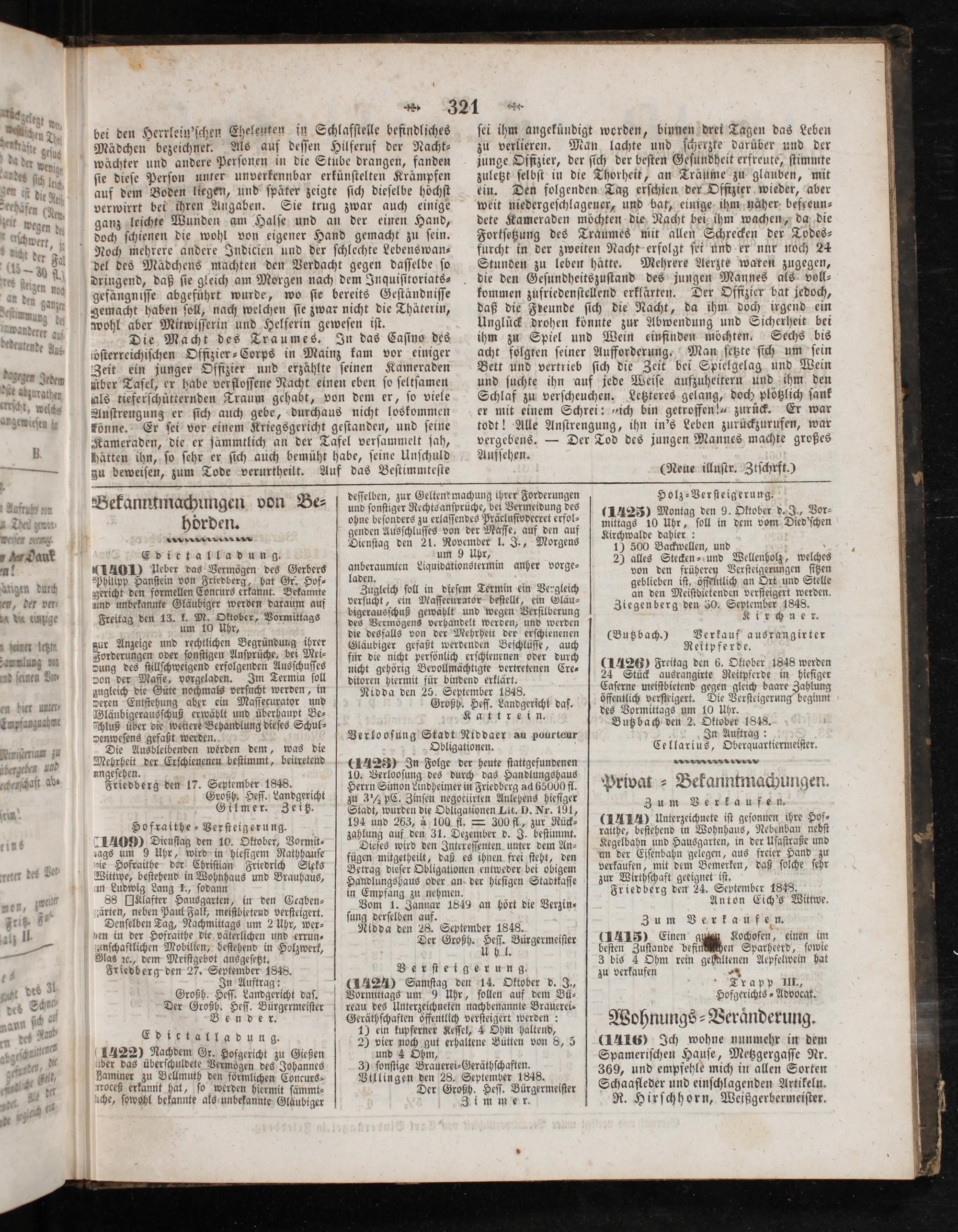 Ediectalladung. 1401) Ueber das Vermögen des Gerbers Philipp Hanſtein von Friedberg, hat Gr. Hof⸗ gericht den formellen Concurs erkannt. Bekannte und unbekannte Gläubiger werden daraum auf