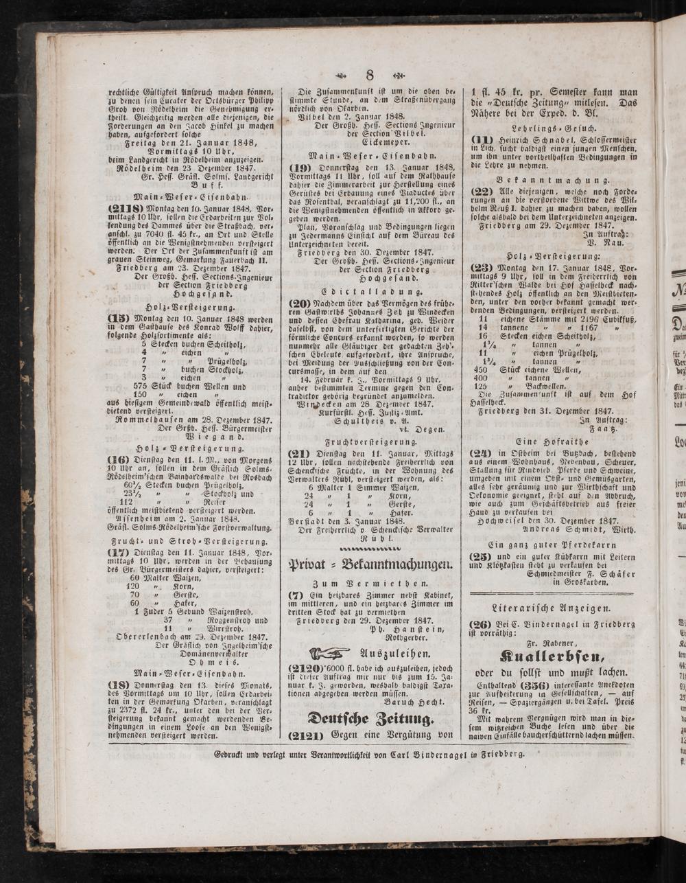 (22) Alle diejenigen, welche noch Forde— rungen an die verſtorbene Wittwe des Wil⸗ helm Reuß I. dahier zu machen haben, wollen ſolche alsbald bei dem Unterzeichneten anzeigen. Friedberg am 29. Dezember 1847. In Auftraz: V. Nau. Holz⸗Verſteigerung: (23) Montag den 17. Januar 1848, Vor⸗ mittags 9 Uhr, ſoll in dem Freiherrlich von Ritter'ſchen Walde bei Hof Haſſelheck nach⸗ ſtehendes Holz öffentlich an den Meiſtbieten— den, unter den vorher bekannt gemacht wer⸗ denden Bedingungen, verſteigert werden. 11 eichene Stämme mit 2196 Cubikfuß,