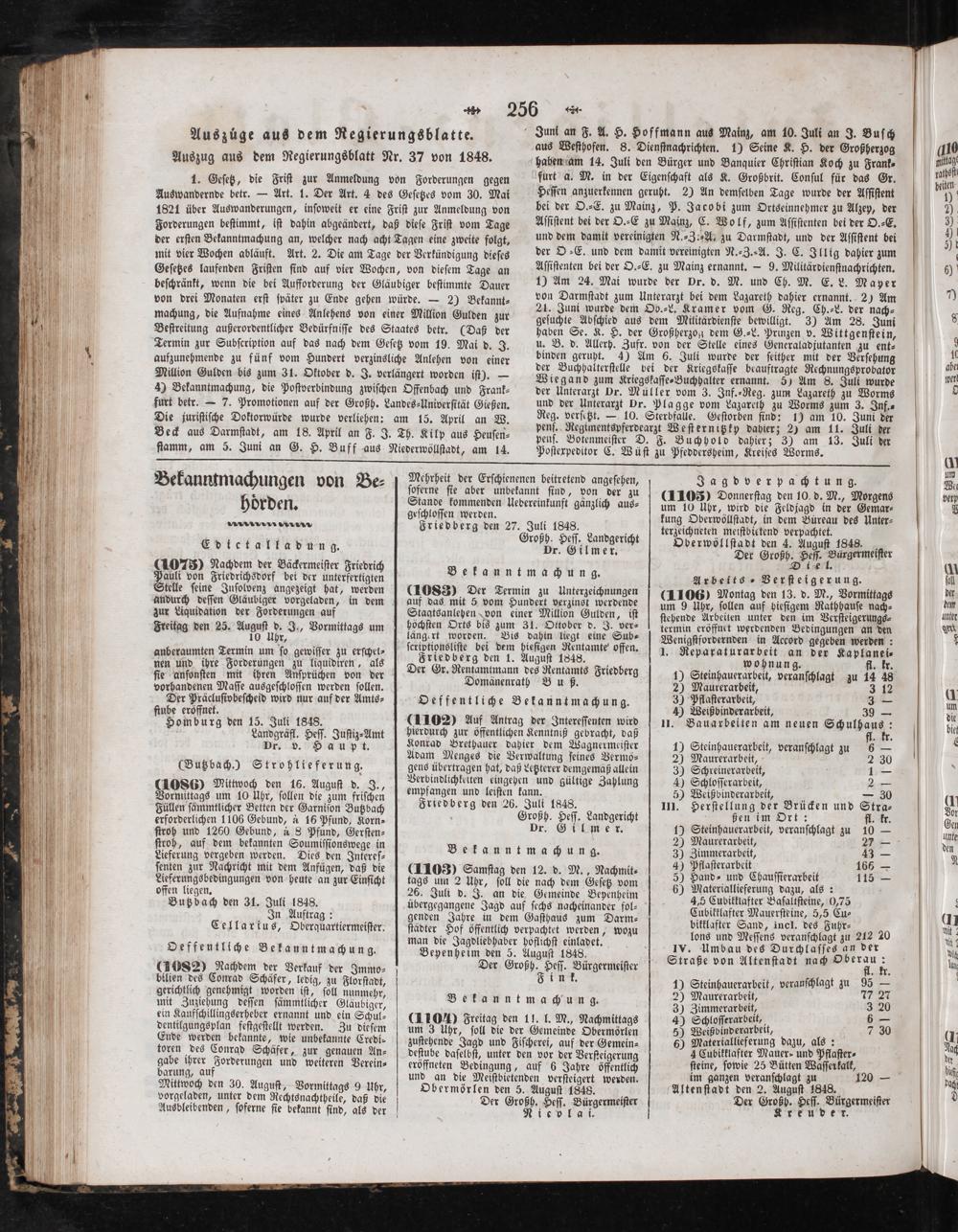 1. Geſetz, die Friſt zur Anmeldung von Forderungen gegen Auswandernde betr.— Art. 1. Der Art. 4 des Geſetzes vom 30. Mai 1821 über Auswanderungen, inſoweit er eine Friſt zur Anmeldung von Forderungen beſtimmt, iſt dahin abgeändert, daß dieſe Friſt vom Tage der erſten Bekanntmachung an, welcher nach acht Tagen eine zweite folgt, mit vier Wochen abläuft. Art. 2. Die am Tage der Verkündigung dieſes Geſetzes laufenden Friſten ſind auf vier Wochen, von dieſem Tage an beſchränkt, wenn die bei Aufforderung der Gläubiger beſtimmte Dauer von drei Monaten erſt ſpäter zu Ende gehen würde.— 2) Bekannt⸗ machung, die Aufnahme eines Anlehens von einer Million Gulden zur Beſtreitung außerordentlicher Bedürfniſſe des Staates betr.(Daß der Termin zur Subſcription auf das nach dem Geſetz vom 19. Mai d. J. aufzunehmende zu fünf vom Hundert verzinsliche Anlehen von einer Million Gulden bis zum 31. Oktober d. J. verlängert worden iſt).— 4) Bekanntmachung, die Poſtverbindung zwiſchen Offenbach und Frank⸗ furt betr.— 7. Promotionen auf der Großh. Landes⸗Univerſität Gießen. Die juriſtiſche Doktorwürde wurde verliehen: am 15. April an W. Beck aus Darmſtadt, am 18. April an F. J. Th. Kilp aus Heuſen⸗ ſtamm, am 5. Juni an G. H. Buff aus Niederwöllſtadt, am 14.