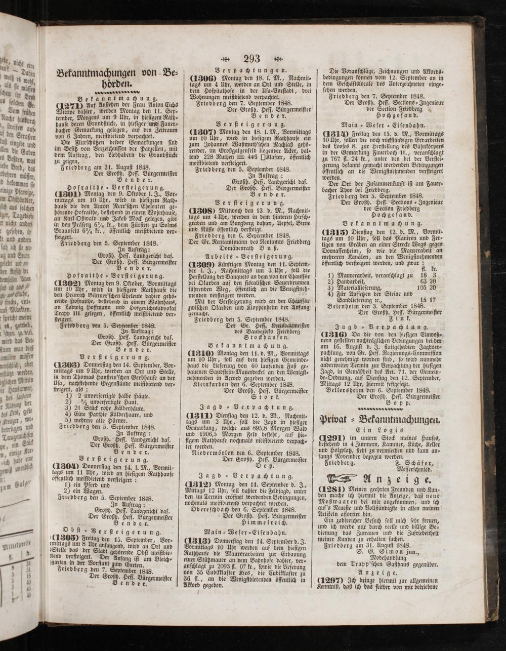 1) ein Pferd und 2) ein Wagen. Friedberg den 5. September 1848. In Auftrag: Großh. Heſſ. Landgericht daſ. Der Großh. Heſſ. Bürgermeiſter 8 Bender.