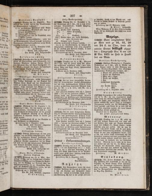 (1706) Etwaige Forderungen an den ganz geringen, von den Erben ausgeſchlagenen, Nach⸗ laß des verſtorbenen Samuel Frankfurter von hier, ſind ſogewiß binnen 14 Tagen bei unter⸗ zeichnetem Gerichte anzumelden, als der Nach⸗ laß ſonſt den bis jetzt aufgetretenen Gläubigern ohne weiteres überlaſſen werden wird. Friedberg den 2. Dezember 1848. Großh. Heſſ. Landgericht daſ. Dr. Gilmer. Main⸗Weſer⸗Eiſenbahn. Section Butzbach. (1707 Mittwoch den 13. d. Mts., Vor⸗ mittags 10 Uhr, ſoll die Beifuhr von 5 Cbkklſtr. Schichtmauerſteinen, aus den Brüchen bei Rocken⸗ berg, auf die Bauſtelle des Viaducts über den Schaubigtweideweg, in der Gemarkung Lang⸗ öns, im Gaſthaus zum Stern dahler, an den enigſtnehmenden verſteigert werden. Butzbach am 5. December 1848. Der Gr. Heſſ. Sections ⸗ Ingenieur Eicke meyer.