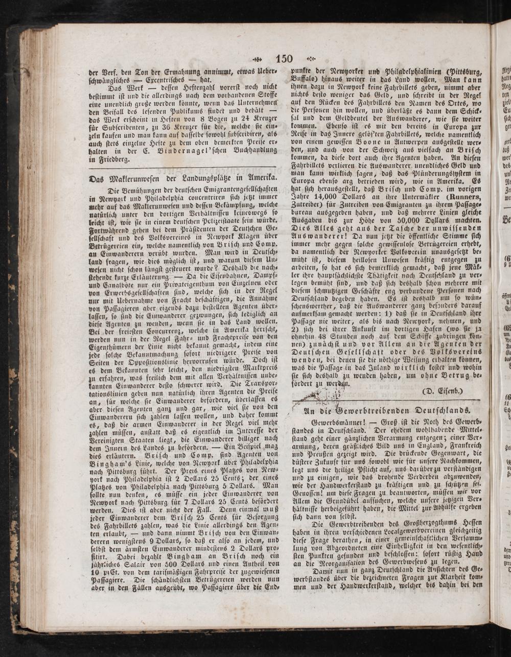 punkte der Newgorker und Philadelphialinien(Pittsburg, 2 8 f Man kann ihnen dazu in Newyork keine Fahrbillets geben, nimmt aber nichts deſto weniger das Geld, und ſchreibt in der Regel auf den Rücken des Fahrbillets den Namen des Ortes, wo die Perſonen hin wollen, und überläßt es dann dem Schick— ſal und dem Geldbeutel der Auswanderer, wie ſie weiter kommen. Ebenſo iſt es mit den bereits in Europa zur Reiſe in das Innere gelöſ'ten Fahrbillets, welche namentlich von einem gewiſſen Boone in Antwerpen ausgeſtellt wer— den, und auch von der Schweiz aus vielfach an Briſch kommen, da dieſe dort auch ihre Agenten haben. An dieſen Fahrbillets verlieren die Auswanderer, unendliches Geld und man kann wirklich ſagen, daß das Plünderungsſyſtem in Europa ebenſo arg betrieben wird, wie in Amerika. Es hat ſich herausgeſtellt, daß Briſch und Com p. im vorigen Jahre 14,000 Dollars an ihre Untermäkler(Runners, Zutreiber) für Zutreiben von Emigranten zu ihrem Paſſage— bureau ausgegeben haben, und daß mehrere Linien gleiche Ausgaben bis zur Höhe von 50,000 Dollars machten. Dies Alles geht aus der Taſche der unwiſſenden Auswanderer! Da nun jetzt die öffentliche Stimme ſich immer mehr gegen ſolche gewiſſeuloſe Betrügereien erhebt, da namentlich der Newyorker Volksvetein unausgeſetzt be⸗ müht iſt, dieſem heilloſen Unweſen kräftig entgegen zu arbeiten, ſo hat es ſich bemerklich gemacht, daß jene Mäk⸗ ler ihre hauptſächlichſte Thätigkeit nach Deutſchland zu ver⸗ legen bemüht ſind, und daß ſich deshalb ſchon mehrere mit dieſem ſchmutzigen Geſchäfte eng verbundene Perſonen nach Deutſchland begeben haben. Es iſt deshalb um ſo wün⸗ ſchenswerther, daß die Auswanderer ganz beſonders darauf aufmerkſam gemacht werden: 1) daß ſie in Deutſchland ihre Paſſage nie weiter, als bis nach Newyork, nehmen, und 2) ſich bei ihrer Ankunft im dortigen Hafen(wo ſie ja