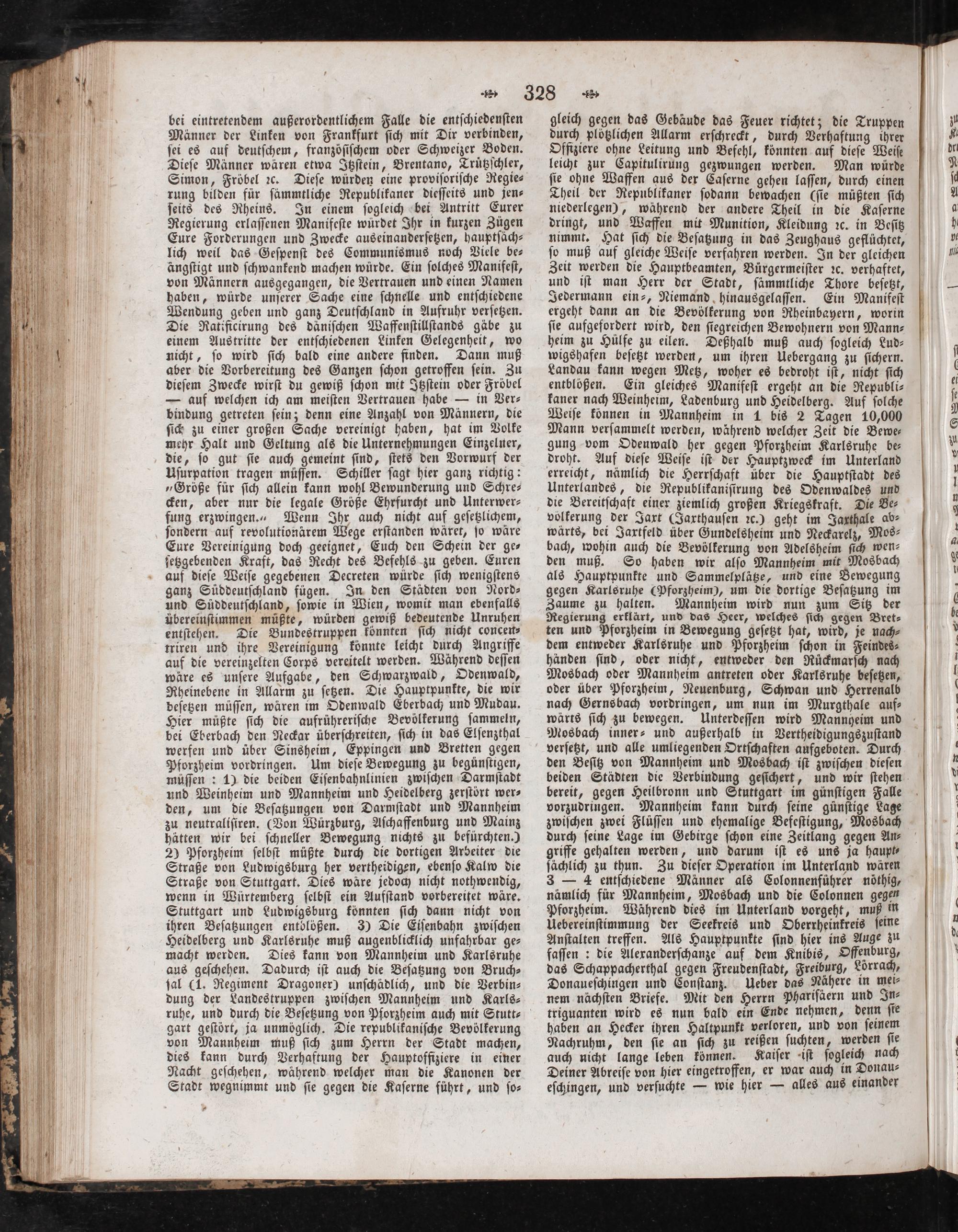 gleich gegen das Gebäude das Feuer richtet; die Truppen durch plötzlichen Allarm erſchreckt, durch Verhaftung ihrer Offiziere ohne Leitung und Befehl, könnten auf dieſe Weiſe leicht zur Capitulirung gezwungen werden. Man würde ſie ohne Waffen aus der Caſerne gehen laſſen, durch einen Theil der Republikaner ſodann bewachen(ſie müßten ſich niederlegen), während der andere Theil in die Kaſerne dringt, und Waffen mit Munition, Kleidung ꝛc. in Beſitz nimmt. Hat ſich die Beſatzung in das Zeughaus geflüchtet, ſo muß auf gleiche Weiſe verfahren werden. In der gleichen Zeit werden die Hauptbeamten, Bürgermeiſter ꝛc. verhaftet, und iſt man Herr der Stadt, ſämmtliche Thore beſetzt, Jedermann ein-, Niemand hinausgelaſſen. Ein Manifeſt ergeht dann an die Bevölkerung von Rheinbayern, worin ſie aufgefordert wird, den ſiegreichen Bewohnern von Mann⸗ heim zu Hülfe zu eilen. Deßhalb muß auch ſogleich Lud⸗ wigshafen beſetzt werden, um ihren Uebergang zu ſichern. Landau kann wegen Metz, woher es bedroht iſt, nicht ſich entblößen. Ein gleiches Manifeſt ergeht an die Republi⸗ kaner nach Weinheim, Ladenburg und Heidelberg. Auf ſolche Weiſe können in Mannheim in 1 bis 2 Tagen 10,000 Mann verſammelt werden, während welcher Zeit die Bewe— gung vom Odenwald her gegen Pforzheim Karlsruhe be— droht. Auf dieſe Weiſe iſt der Hauptzweck im Unterland erreicht, nämlich die Herrſchaft über die Hauptſtadt des Unterlandes, die Republikaniſirung des Odenwaldes und die Bereitſchaft einer ziemlich großen Kriegskraft. Die Be⸗ volkerung der Jaxt(Jaxthauſen ꝛc.) geht im Jaxthale ab⸗ wärts, bei Jaxtfeld über Gundelsheim und Neckarelz, Mos⸗ bach, wohin auch die Bevölkerung von Adelsheim ſich wen⸗ den muß. So haben wir alſo Mannheim mit Mosbach als Hauptpunkte und Sammelplätze, und eine Bewegung gegen Karlsruhe(Pforzheim), um die dortige Beſatzung im Zaume zu halten. Mannheim wird nun zum Sitz der Regierung erklärt, und das Heer, welches ſich gegen Bret⸗ ten und Pforzheim in Bewegung geſetzt hat, wird, je nach⸗ dem entweder Karlsruhe und Pforzheim ſchon in Feindes⸗ händen ſind, oder nicht, entweder den Ruͤckmarſch nach Mosbach oder Mannheim antreten oder Karlsruhe beſetzen, oder über Pforzheim, Neuenburg, Schwan und Herrenalb nach Gernsbach vordringen, um nun im Murgthale auf⸗ wärts ſich zu bewegen. Unterdeſſen wird Mannheim und Mosbach inner⸗ und außerhalb in Vertheidigungszuſtand verſetzt, und alle umliegenden Ortſchaften aufgeboten. Durch den Beſitz von Mannheim und Mos bach iſt zwiſchen dieſen beiden Städten die Verbindung geſichert, und wir ſtehen bereit, gegen Heilbronn und Stuttgart im günſtigen Falle vorzudringen. Mannheim kann durch ſeine günſtige Lage zwiſchen zwei Flüſſen und ehemalige Befeſtigung, Mosbach durch ſeine Lage im Gebirge ſchon eine Zeitlang gegen An⸗ griffe gehalten werden, und darum iſt es uns ja haupt⸗ ſächlich zu thun. Zu dieſer Operation im Unterland wären 3— 4 entſchiedene Männer als Colonnenführer nöthig, nämlich für Mannheim, Mosbach und die Colonnen gegen Pforzheim. Während dies im Unterland vorgeht, muß in Uebereinſtimmung der Seekreis und Oberrheinkreis ſeine Anſtalten treffen. Als Hauptpunkte ſind hier ins Auge zu faſſen: die Alexanderſchanze auf dem Knibis, Offenburg, das Schappacherthal gegen Freudenſtadt, Freiburg, Lörrach, Donaueſchingen und Conſtanz. Ueber das Nähere in mei⸗ nem nächſten Briefe. Mit den Herrn Phariſäern und In⸗ triguanten wird es nun bald ein Ende nehmen, denn ſie haben an Hecker ihren Haltpunkt verloren, und von ſeinem Nachruhm, den ſie an ſich zu reißen ſuchten, werden ſie auch nicht lange leben können. Kaiſer iiſt ſogleich nach Deiner Abreiſe von hier eingetroffen, er war auch in Donau⸗ eſchingen, und verſuchte— wie hier— alles aus einander